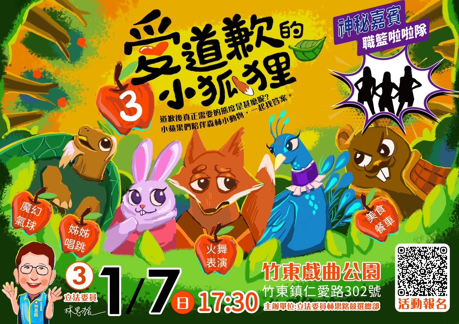 7日的親子舞台劇「愛道歉的小狐狸」演出活動,下午5點在竹東戲曲公園免費登場,活動一樣安排了小丑哥哥折氣球、雜耍火舞表演、姊姊帶動跳,及職籃啦啦隊擔任神秘嘉賓。