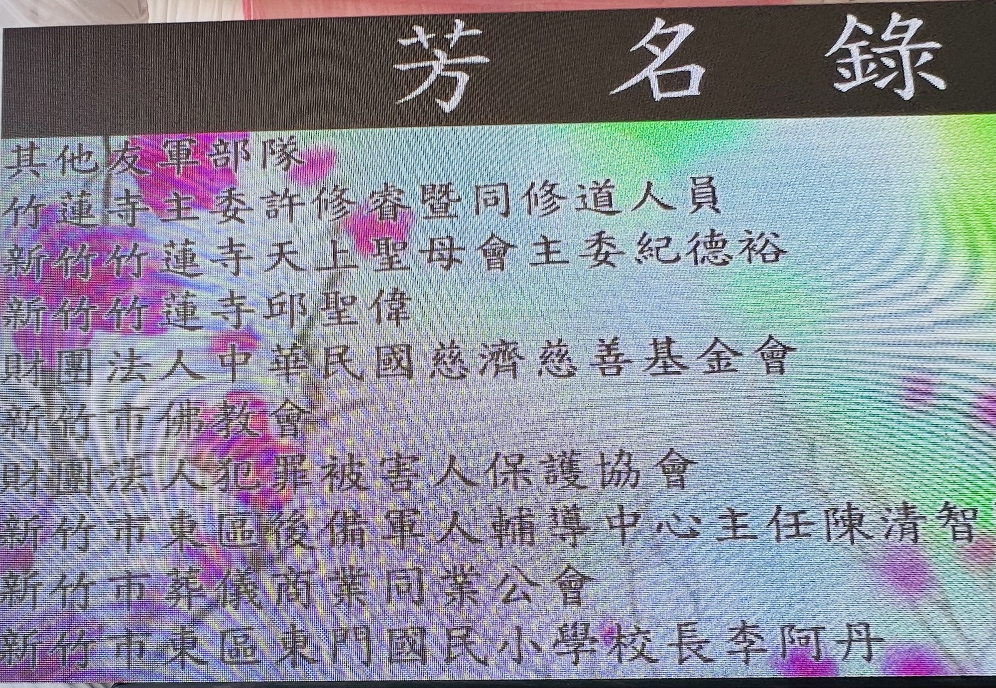 芳名錄電視牆上列有新竹市議長許修睿竹蓮寺主委及同修道友 何高祿攝