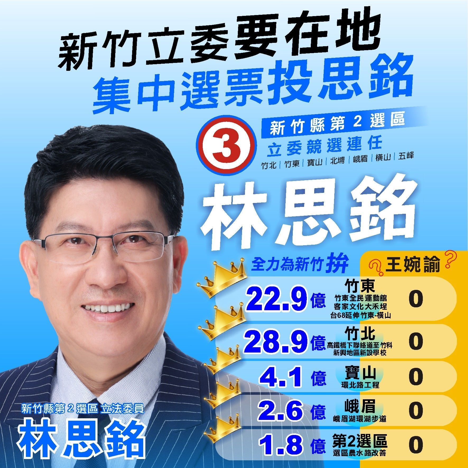 林思銘謝謝鄉親四年前的持,讓他有機會進入立法院監督政府運作、為新竹鄉親服務。新竹家鄉的發展速度飛快,交通、教育的需求成長,早已不是地方政府所能負擔,過去四年,他努力在中央爭取重大交通工程經費,也成功爭取興建了勝利國中、嘉豐國小、文中2、文小3等新興地區新建學校,甚至讓全縣中小學班班裝上冷氣。