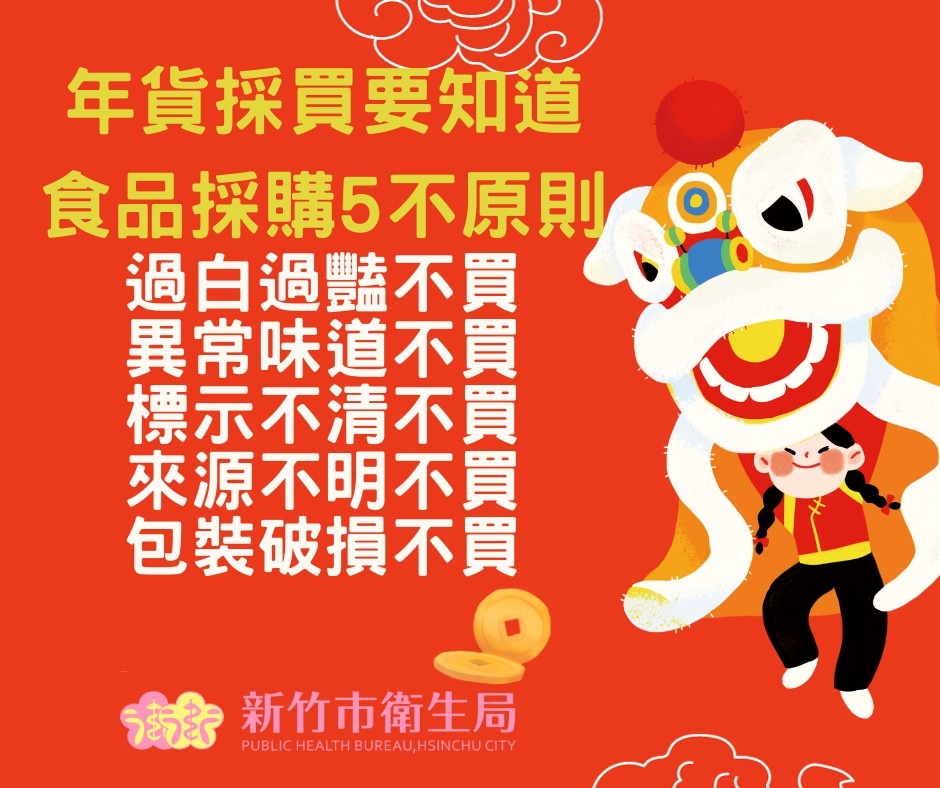 民眾採買食品可遵循5不原則「過白過豔不買、異常味道不買、標示不清不買、來源不明不買、包裝破損不買」,並注意營養、熱量、保存條件、添加物等事項,安心消費放心購買,健康過好年