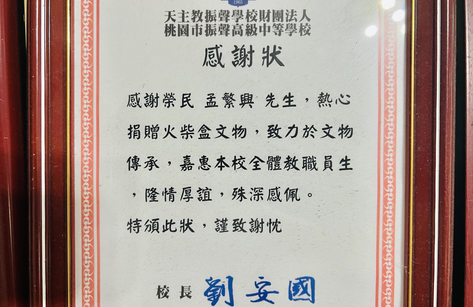 四年前桃園振聲高中董事長劉獻堂,完成他將全部收集的火柴盒捐獻給學校,當教材的心願。把火柴盒全數收納在振聲校園內,供學子觀賞學習,激發、帶動創意思維,發揮創新精神,增加知能提昇競爭力。