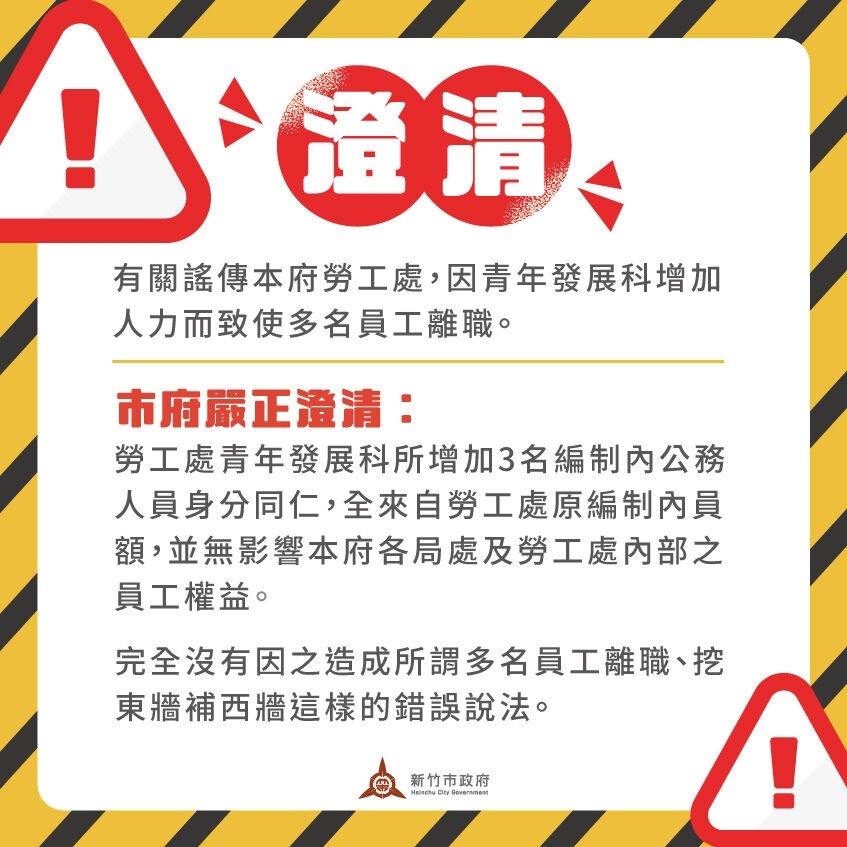 竹市府表示,有關今(19)日謠傳竹市勞工處,因青年發展科增加人力,致使多名員工離職,市府嚴正澄清如下;
