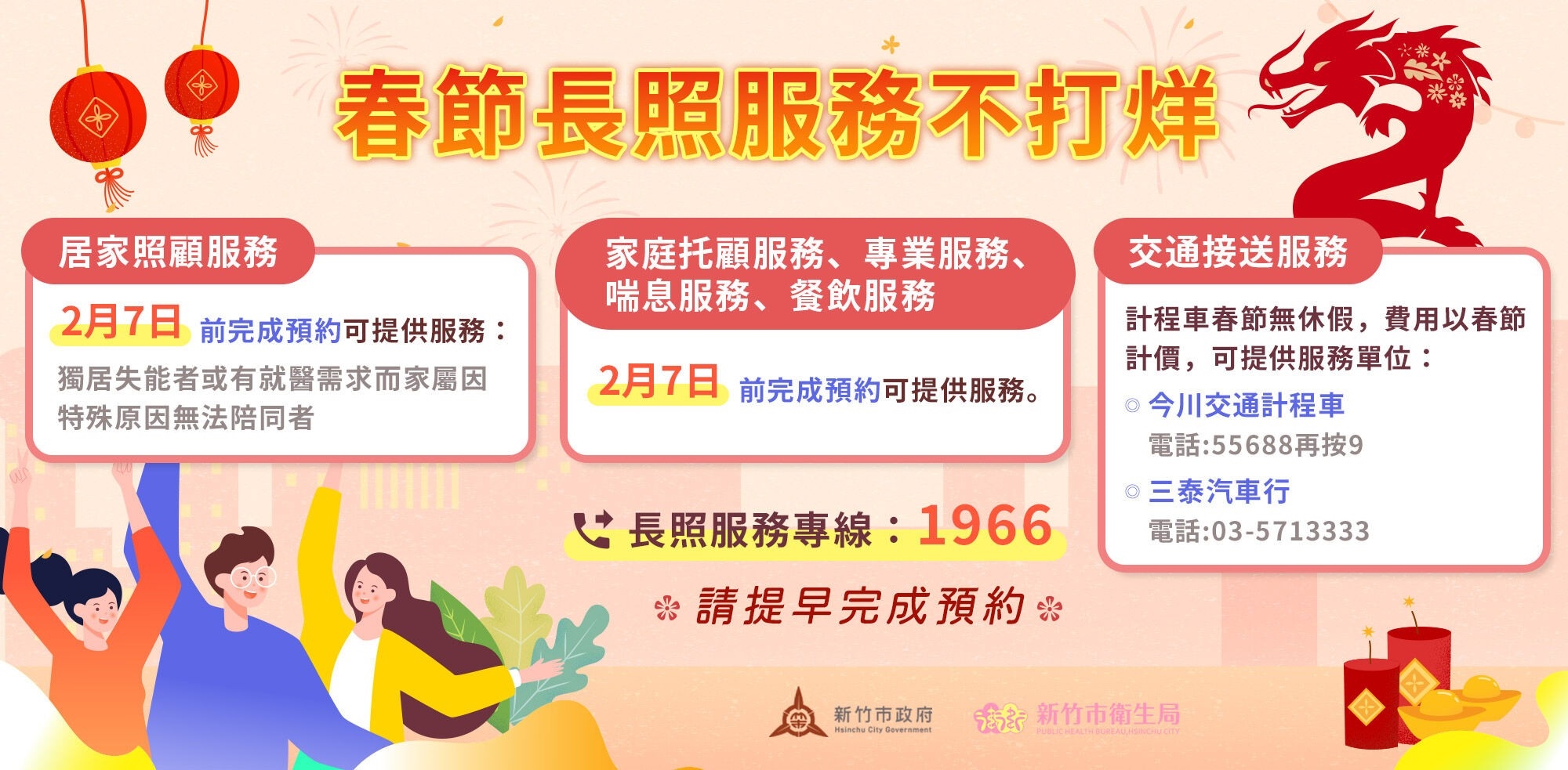 春節連假期間如有長照服務相關需求,可於2月7日前完成預約申請,讓必要性的長照及喘息服務得以延續,減輕家庭照顧壓力,平平安安過好年。
