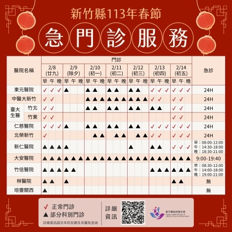 今年農曆春節連假即將到來,新竹縣府衛生局為方便民眾就醫參考,特別彙整轄內醫院春節連假急門診服務表,如有醫療需要的民眾可多加利用,詳細資訊請至衛生局網站查詢https://www.hcshb.gov.tw/News_Content.aspx?n=24&s=98848。