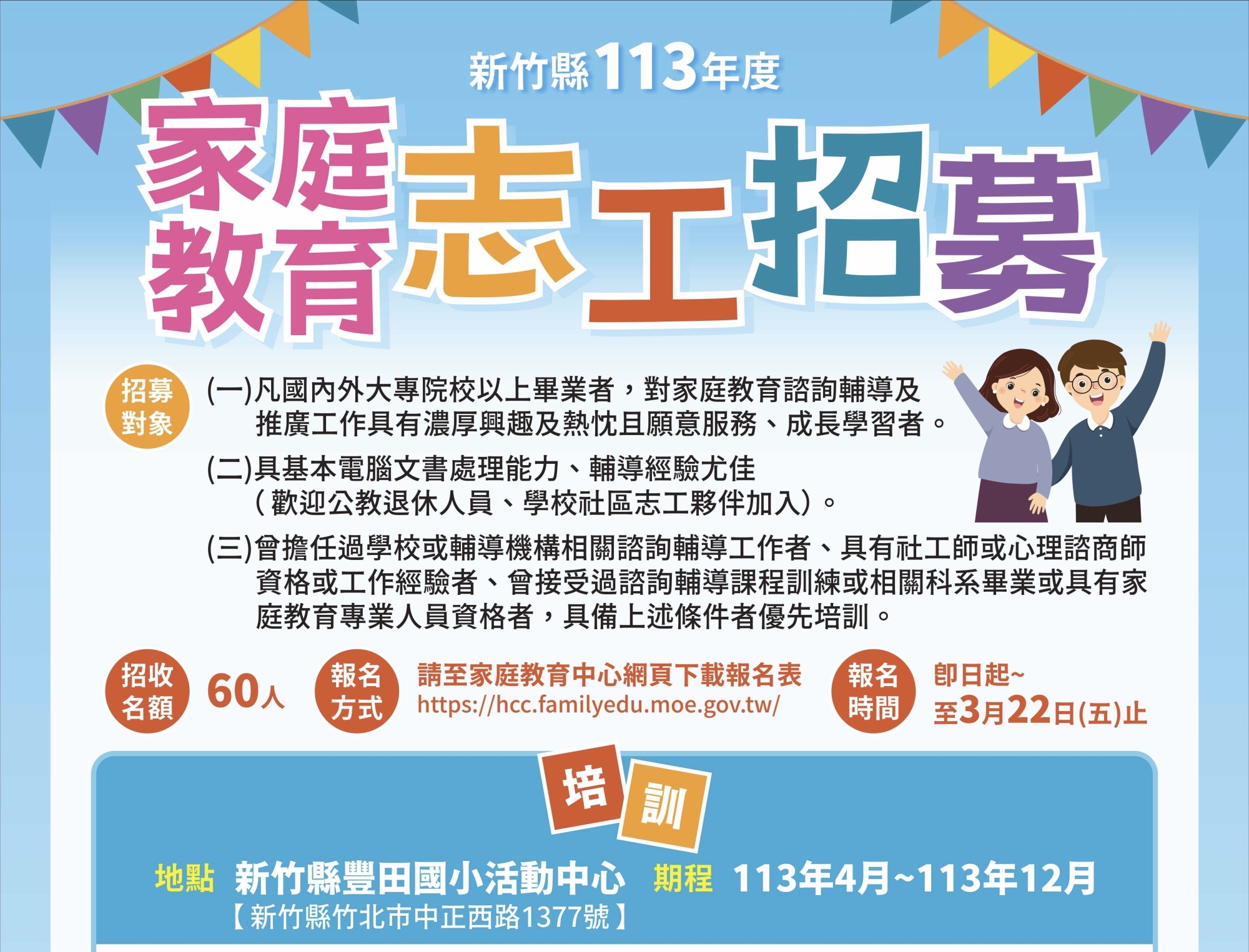今年度新志工招募即日起開放報名至3月22日截止,預計招募60名熱情志工,只要對家庭教育諮詢輔導及推廣工作具有濃厚興趣,且願意服務、成長學習者,誠摯歡迎加入中心志工行列。