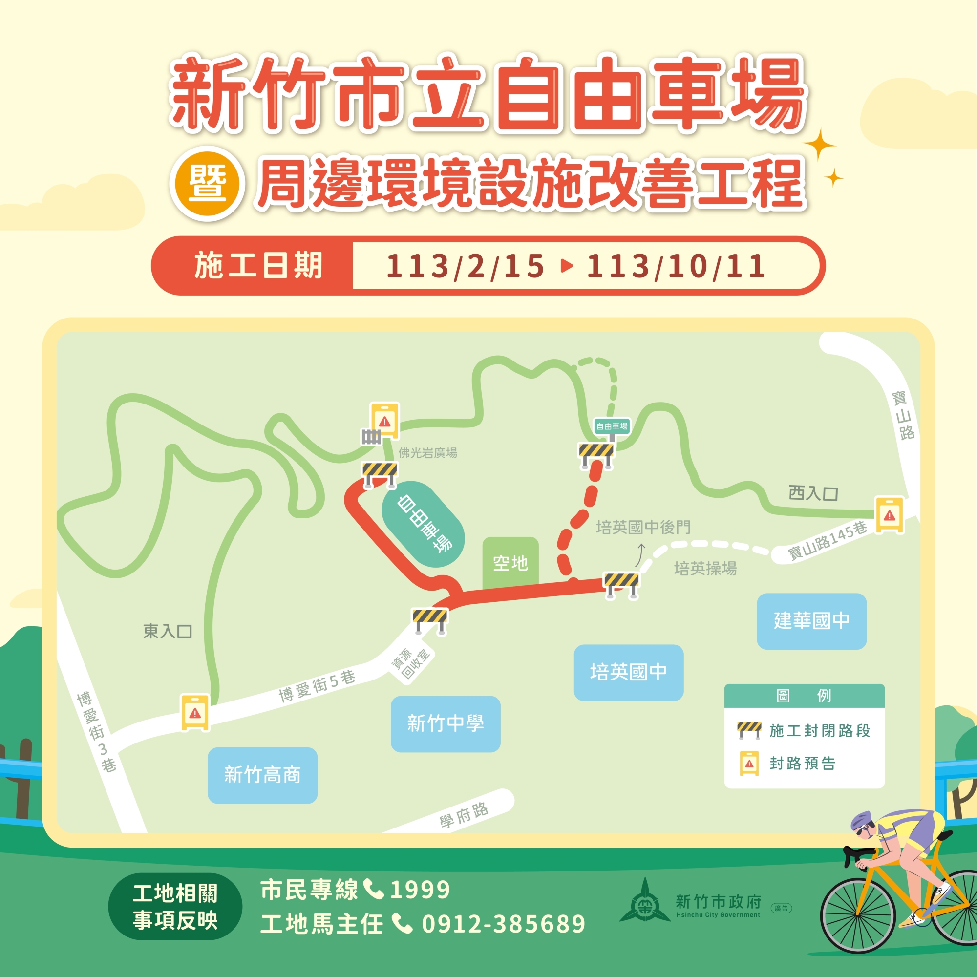 「新竹市立自由車場暨周邊環境設施改善工程」已於1月24日舉行開工典禮,為方便市民於農曆過年期間,仍可至十八尖山走春遊憩,故將工期定於農曆春節過後2月15日(四)至10月11日(五)進行施工,考量施工期間市民及學生安全,預計封閉自由車場周邊部分道路及十八尖山近自由車場周邊步道,詳細道路封閉如附圖如下: