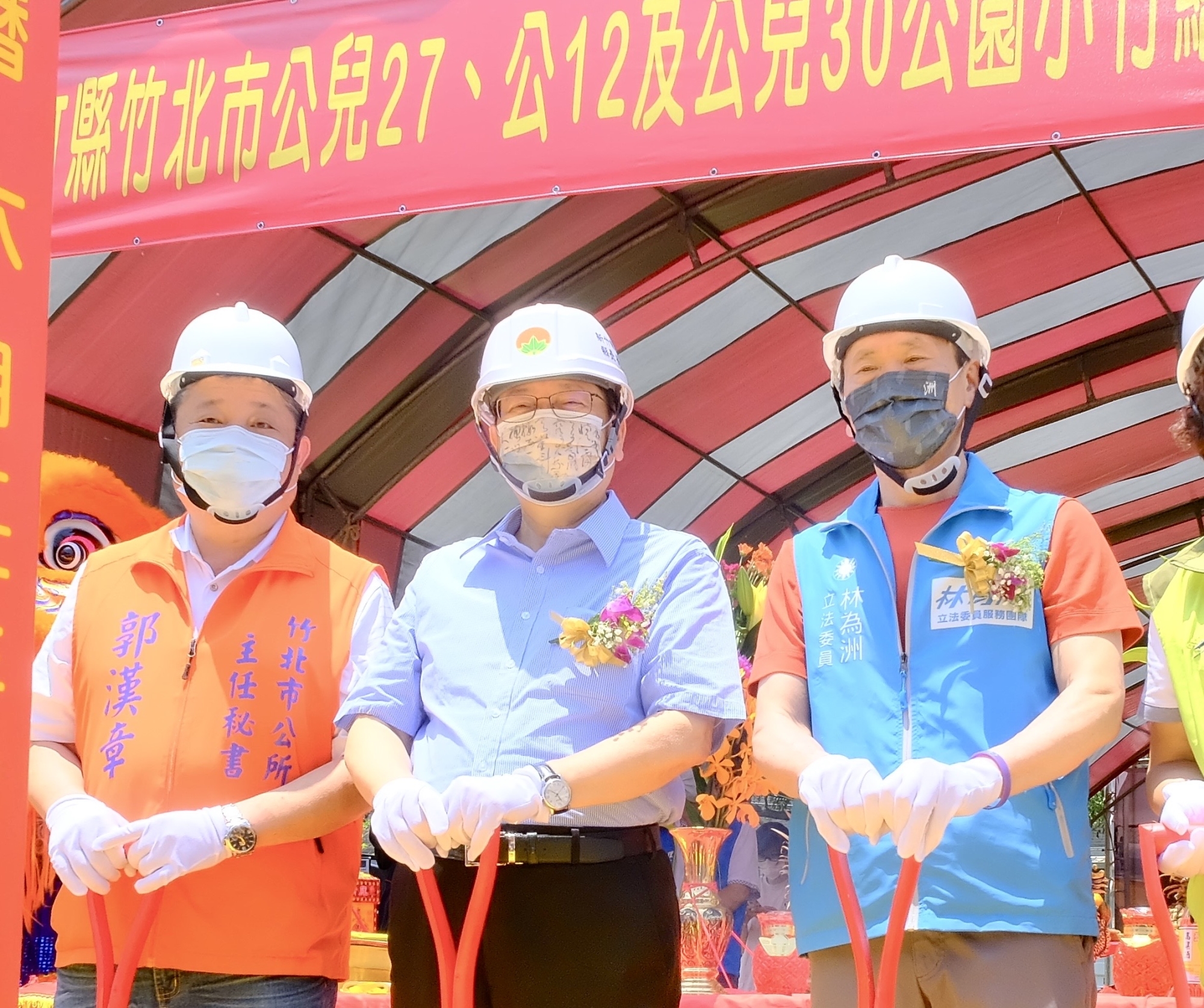竹北市三公園開工儀式,縣長楊文科居中,把林為洲(右)和郭漢章(左)兩竹北市長參選人自然分離