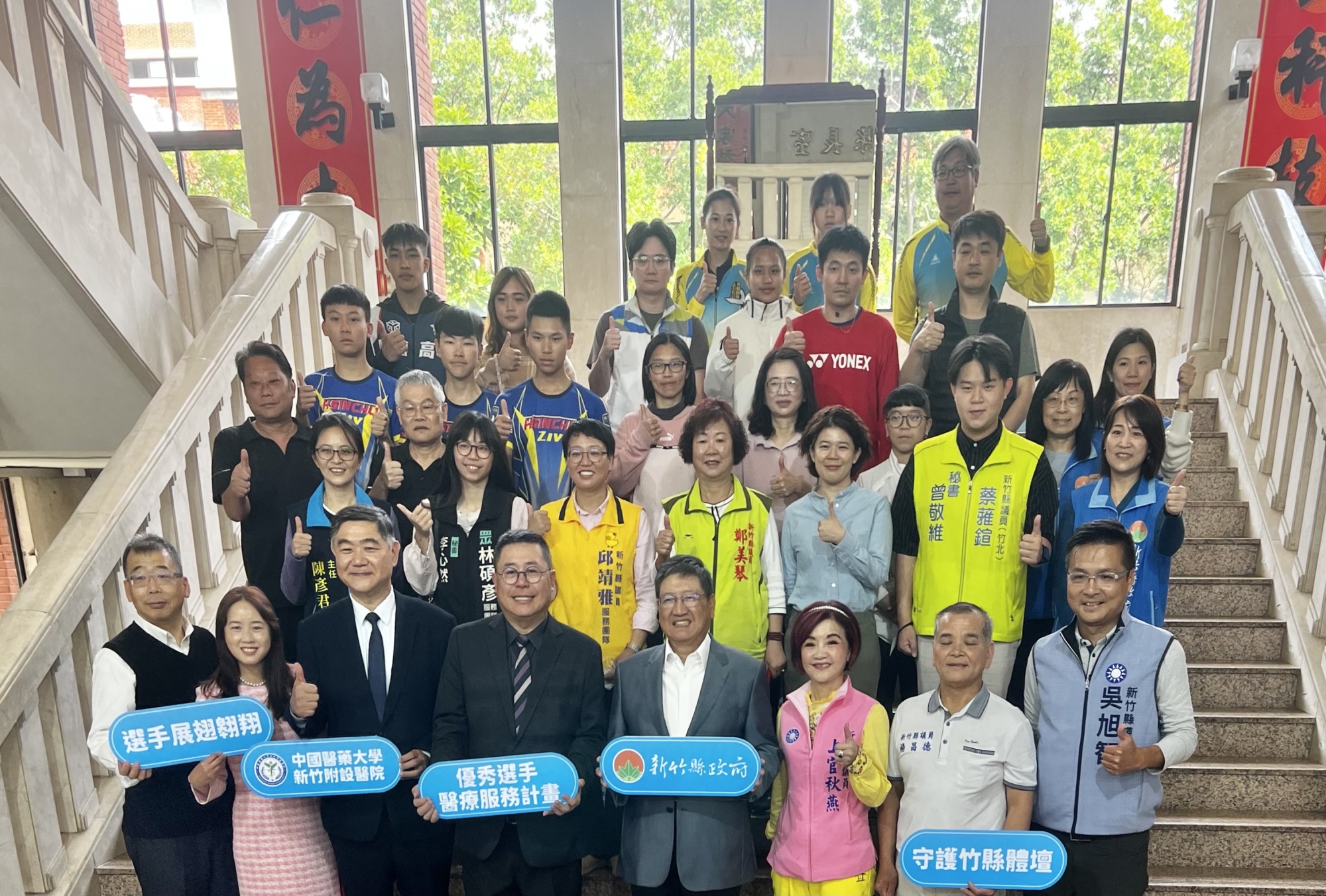 為使優秀運動員實現訓練目標及擁有健康身體,新竹縣政府用實際行動展現對於新竹縣體育團體、體育活動的支持,今(20日)與中國醫藥大學新竹附設醫院舉辦「新竹縣優秀運動選手醫療服務計畫合作備忘錄簽訂儀式」,由新竹縣長楊文科、中國醫藥大學新竹附設醫院院長陳自諒共同簽署,多名新竹縣議員、教練及選手見證,未來將協助優秀運動選手在就醫、醫療上的服務,全力支援優秀運動選手。