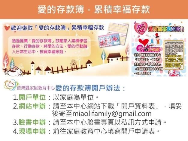 苗縣家庭教育中心辦理「愛的存款簿」以鼓勵民眾重視家庭價值並努力經營家庭關係,透過「學習存款」、「行動存款」及「閱讀存款」等方式累積。歡迎民眾參加各項家庭教育課程活動累計學習時數,將對家人、家庭的付出、關心和肯定寫成紀錄;閱讀【家庭教育優良專書】線上填寫閱讀心得來進行愛的存款。