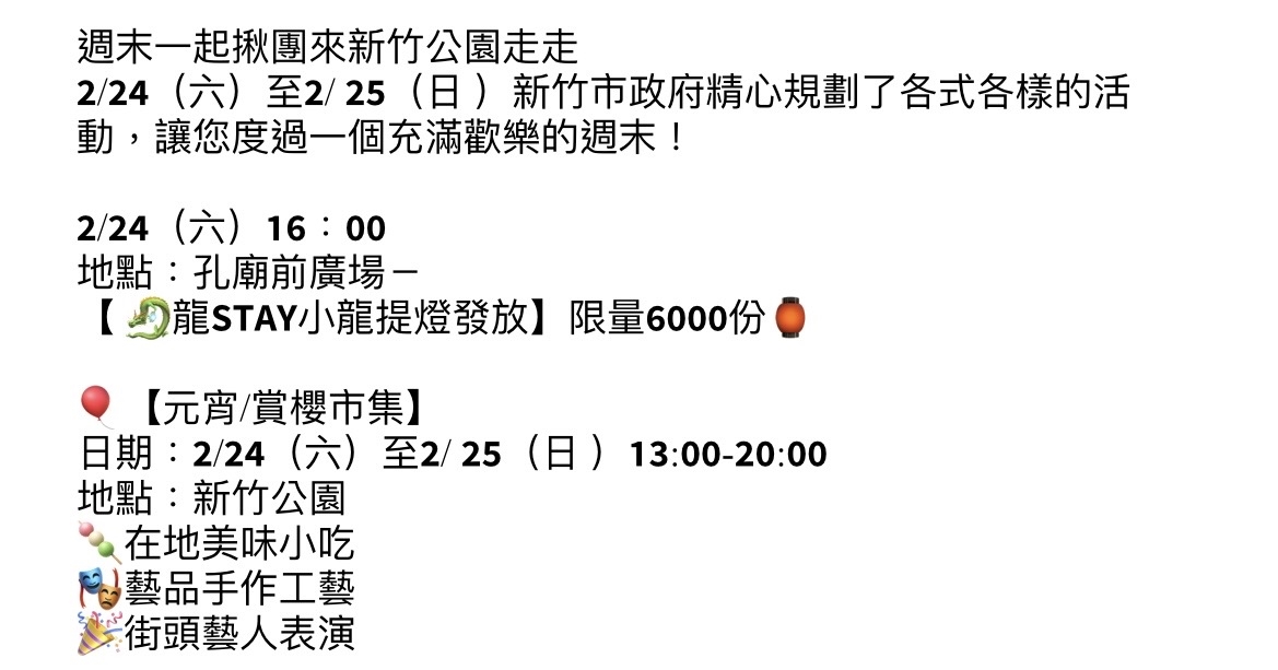 公園里長林季蓉說,歡迎週末及元宵假期一起揪團來新竹公園走走,觀賞精心規劃了各式各樣的活動,讓您度過一個充滿歡樂的週末!孔廟前廣場小龍提燈發放,元宵/賞櫻市集,新竹公園🍡在地美味小吃🎭藝品手作工藝🎉街頭藝人表演,元宵晚會新竹公園圓形廣場🎪精彩表演有天馬戲創作劇團等等多樣不同視覺享受。