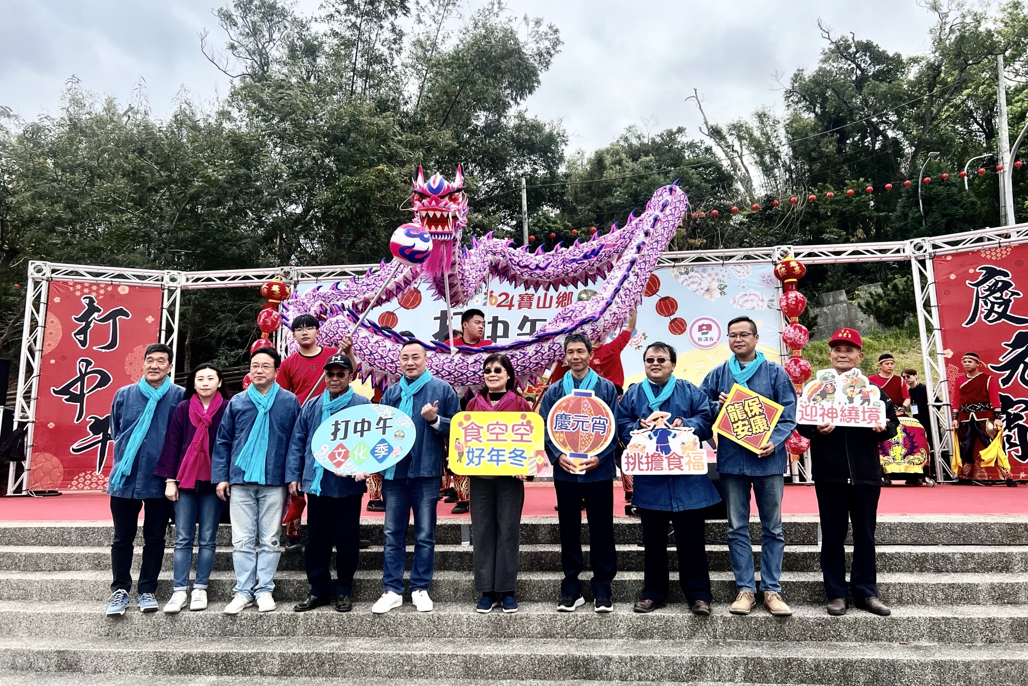 「打中午文化季」除今天(24日)於新城村、三峰村神明遶境祈福,昨天也於深井村、寶斗村已完成香案祭拜,祈求新的一年鄉運昌隆、百姓平安。明(25日)元宵嘉年華將在寶山國中舉行,上午9時有報名即額滿的「客家歌謠大賽」,「創意米食大賽」更是以龍年為應景主題來創作出好吃又有特色的米食料理。