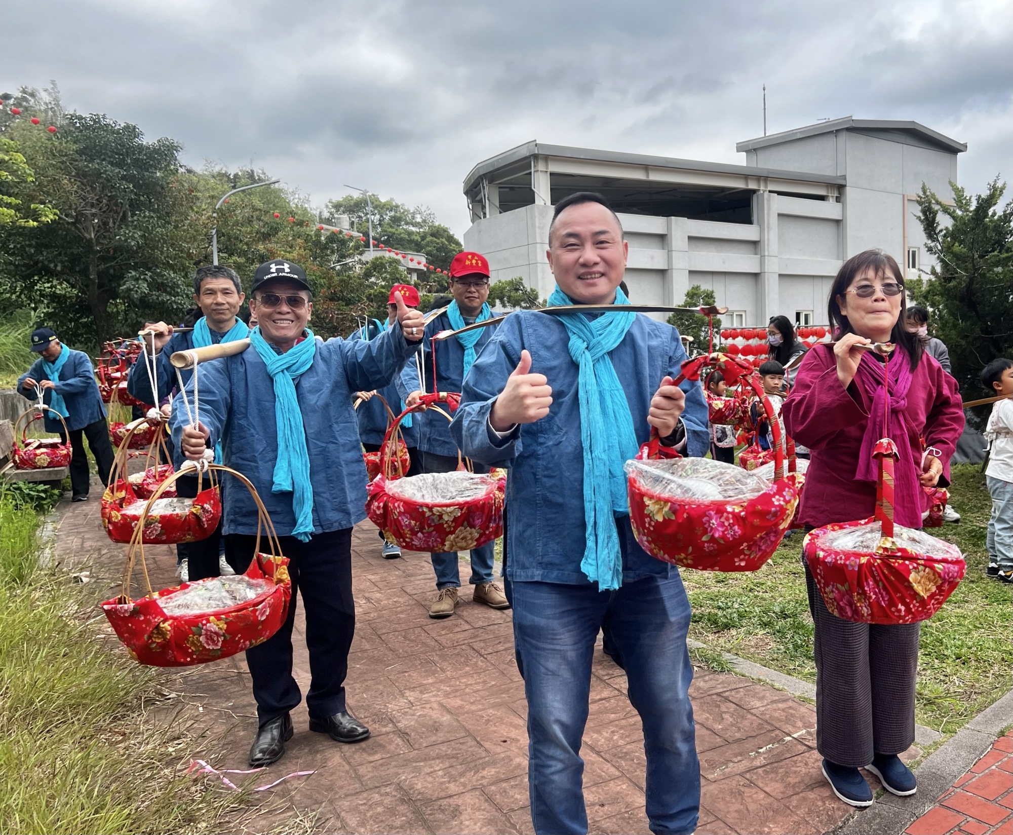 邱振瑋(前中)、鄉代主席古仁樺(左)領頭挑擔奉飯美食 何高祿攝