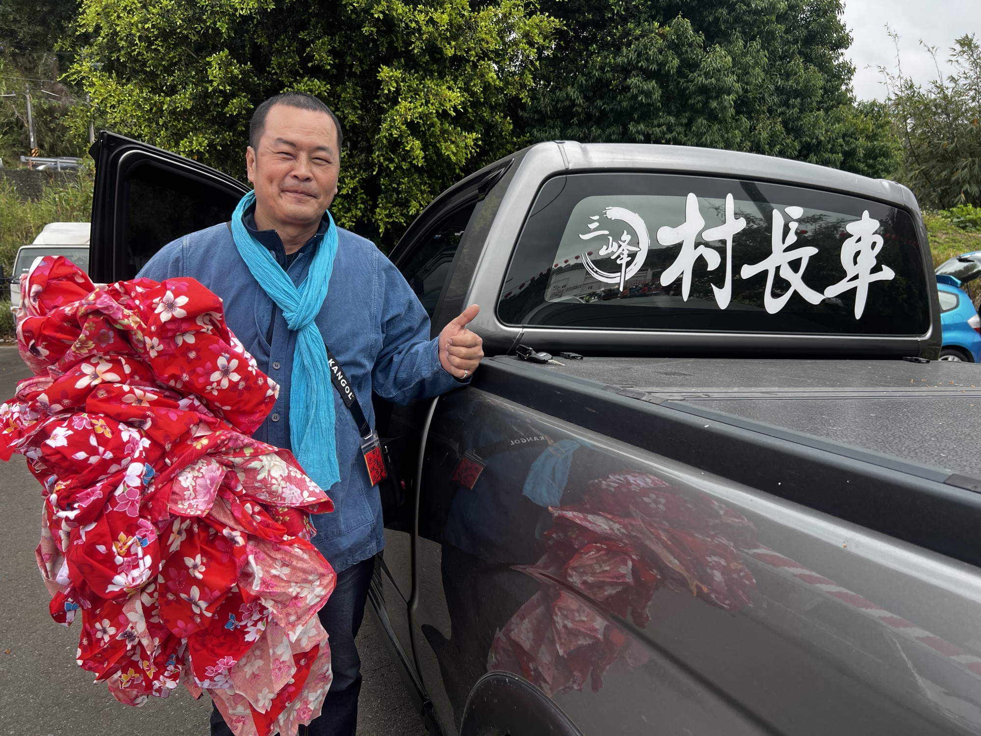 三峰村長黃國城手抱傳統客家花布打中午 何高祿攝