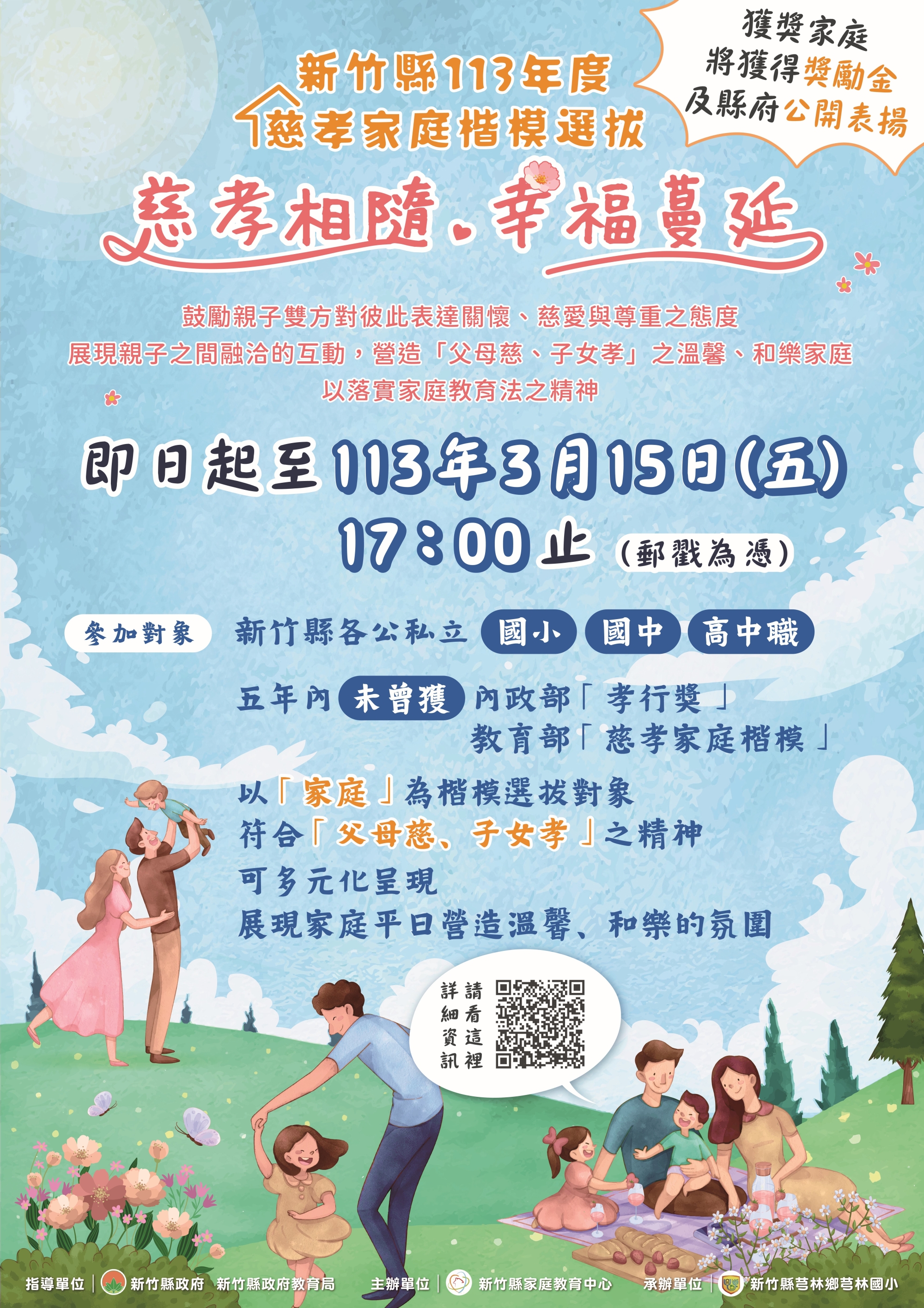 竹縣舉辦慈孝家庭楷模選拔已超過10年的時間,今年度延續往年透過公開徵件的方式,以新竹縣學生家庭為對象,分為高中職、國中和國小三個組別,每組預計選拔出5組家庭,只要符合5年內未曾獲得內政部「孝行獎」、教育部及本縣「慈孝家庭楷模」表揚,並經所屬學校推薦送件者皆可參加,報名期限到113年3月15日(五)止,今(113)年度經獲選之慈孝家庭可得獎勵金,將由新竹縣政府公開表揚。