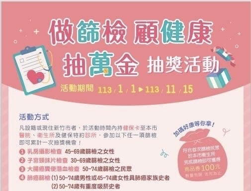 為守護市民健康,竹市府攜手衛福部推廣「五癌篩檢有篩有保庇」活動,提供符合篩檢資格者免費五癌篩檢,包含子宮頸抹片、乳房X光攝影、糞便潛血檢查、口腔黏膜檢查、肺部低劑量電腦斷層掃描等,為提升竹市篩檢率,市府更加碼辦理癌症篩檢送好禮活動,鼓勵市民朋友踴躍參加,呼籲大家在工作忙碌之餘,更要善待自己,與家人一同完成篩檢。