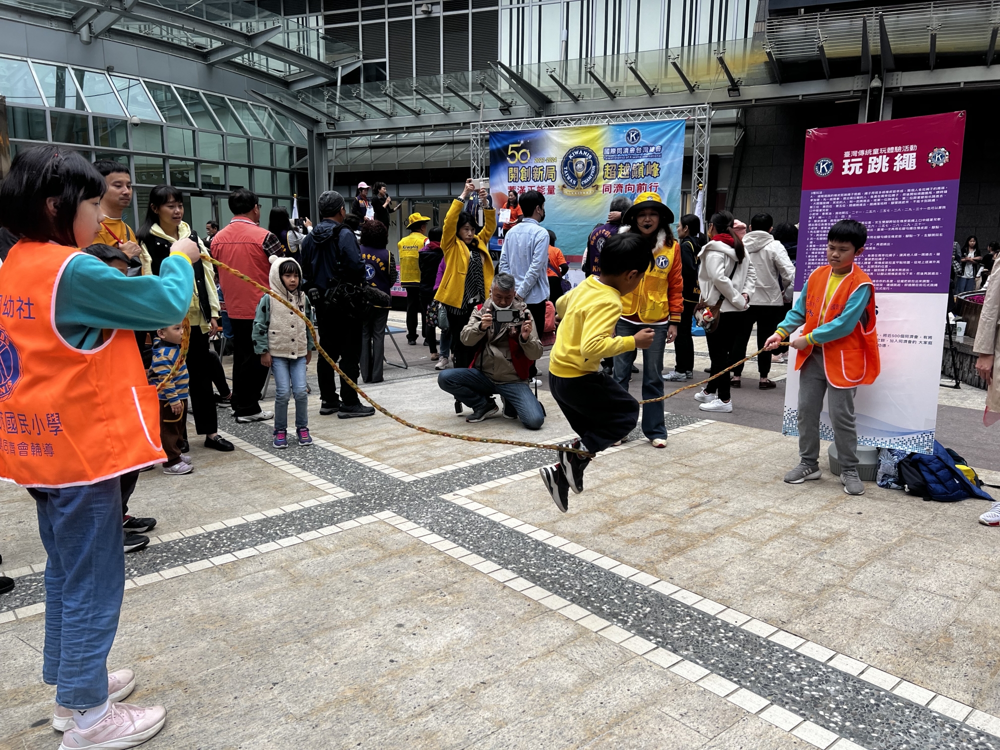 民眾在廣場玩跳繩,唱起兒歌:小皮球、香蕉油,滿地開花 21、256、257、28、29、31……喚起資深民眾,重拾往日兒時快樂的回憶,為巨城帶來親子歡樂氣氛的歌聲。