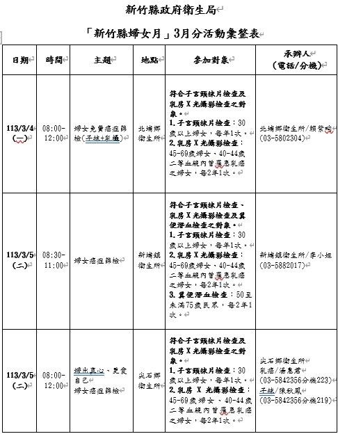迎接3月8日「國際婦女節」,新竹縣政府3月4日至8日在13鄉鎮市衛生所舉辦婦女月「癌症篩檢」活動, 縣長楊文科呼籲女性朋友珍愛自己,相揪參加婦女癌症篩檢,早期發現、早期治療,一起守護健康,參加篩檢有機會抽中2000元超商禮券喔!