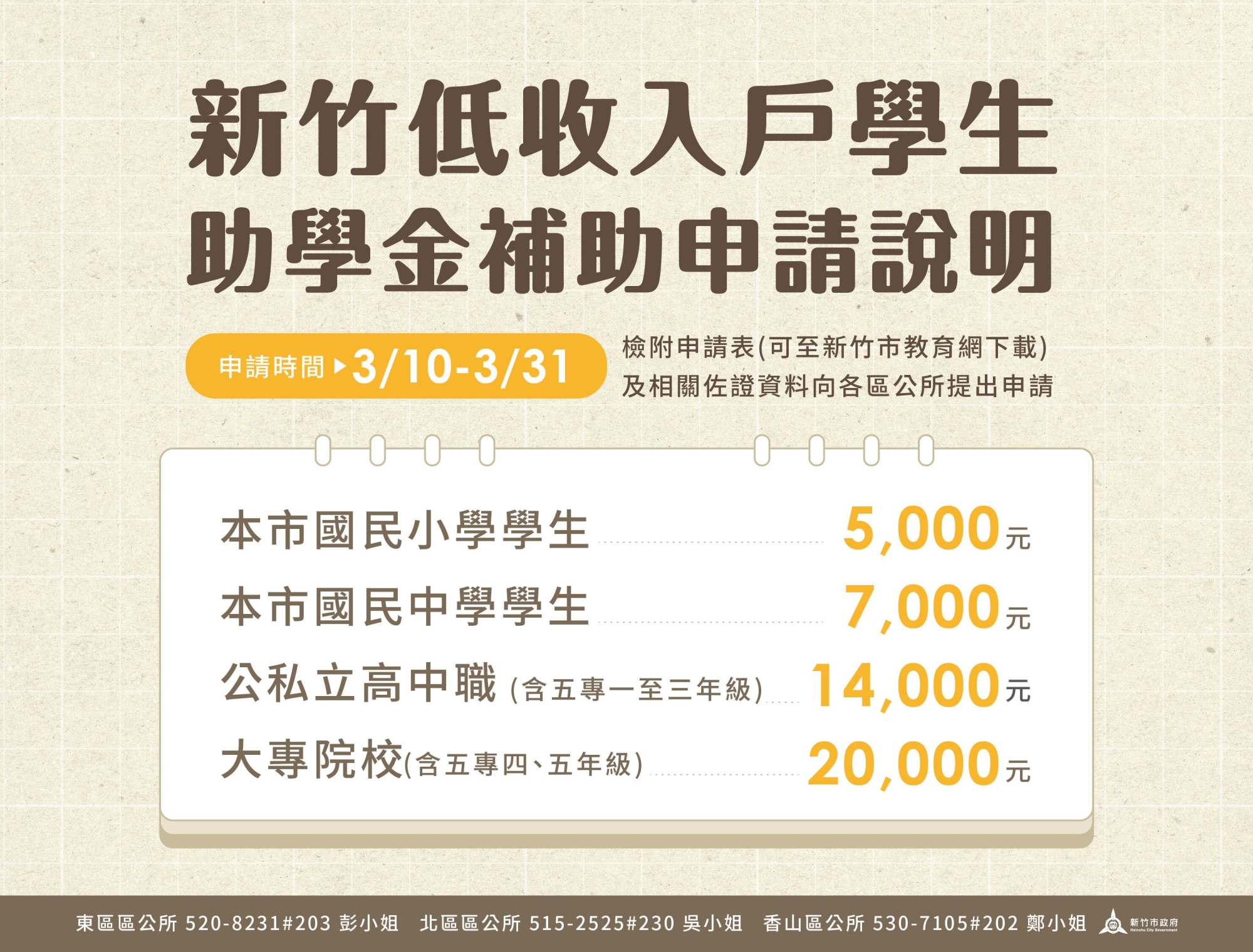 竹市低收入戶學生助學金3/10-3/31開放申請,幫助低收入戶家庭學生減輕就學壓力,保障弱勢學子就學權益!