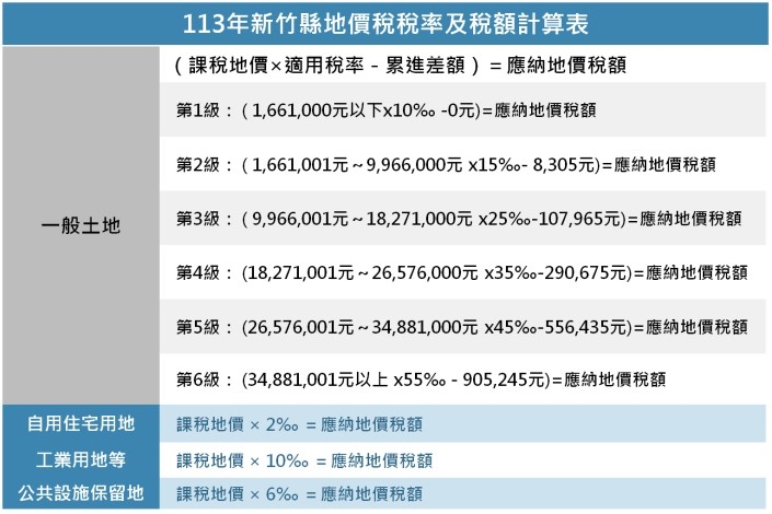 竹縣土地地價於113年1月1日重新公告,地價稅累進起點地價經重新計算為166萬1,000元,較111年累進起點地價153萬3000元,增加12萬8,000元。地價稅各級距稅率及應納稅額計算方式如附件。