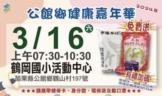 為提供民眾更便利的預防保健篩檢服務,滿足民眾之健康需求,苗栗縣府衛生局結合公館鄉衛生所、公館鄉公所、代表會及大千綜合醫院,於113年3月16日(星期六)上午7:30-10:30在鶴岡國小學生活動中心辦理『公館鄉健康嘉年華』免費整合性健檢活動。