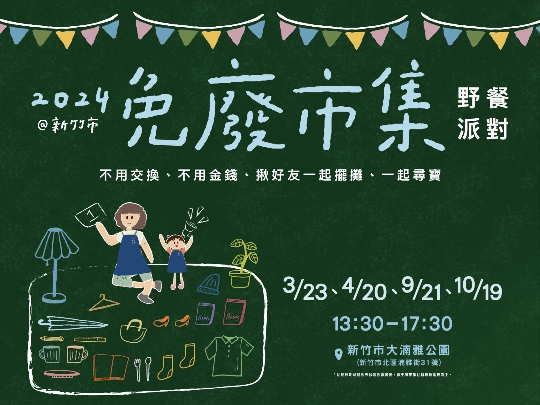 竹市環保局規劃的「免廢市集‧野餐派對新竹市」,至今廣受民眾熱烈好評,已成為民眾分享舊愛物品及尋寶的歡樂市集。