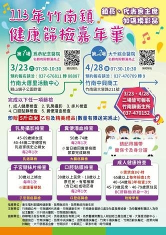 苗栗衛生局結合竹南鎮公所、竹南鎮民代表會、竹南鎮衛生所與為恭及大千醫院資源結合,辦理「竹南鎮健康篩檢嘉年華」大型整合性篩檢活動。兩場篩檢時間分別為:為恭醫院:3月23日上午7:30至10:30在大厝里活動中心;大千醫院:4月28日上午7:30至10:30在中興商工活動中心。