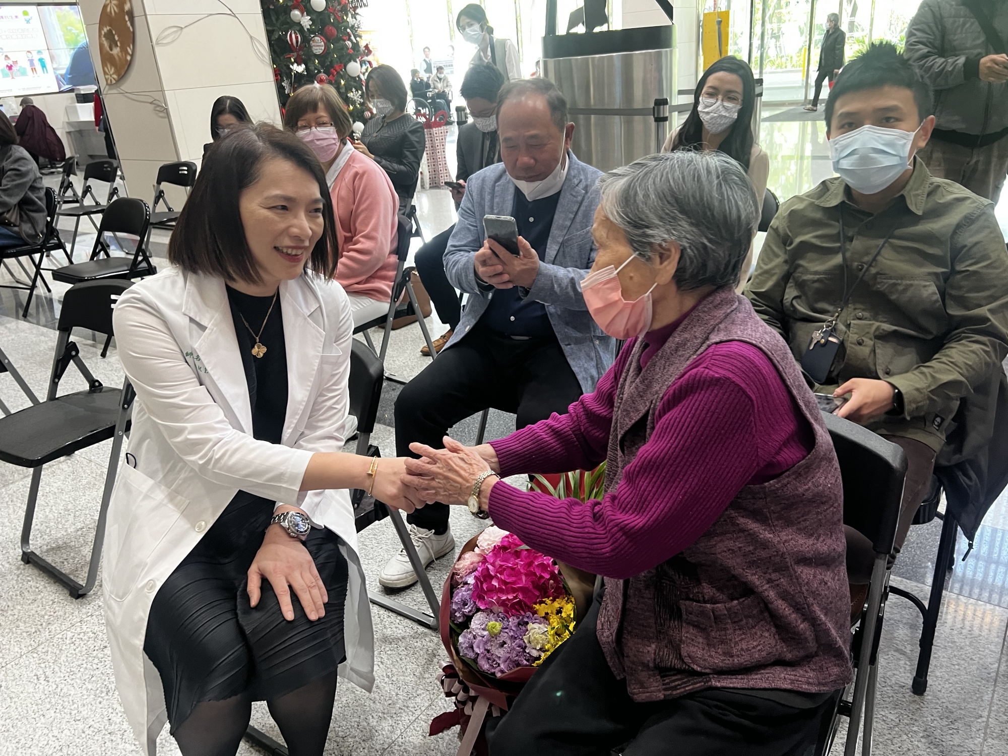 96歲的許廖阿嬤病患和家屬,以及90歲的梁姓阿公病患及家屬,得知沈部長榮獲大腸直腸外科觀摩中心醫師,特別一起來獻花恭喜,表達感謝。