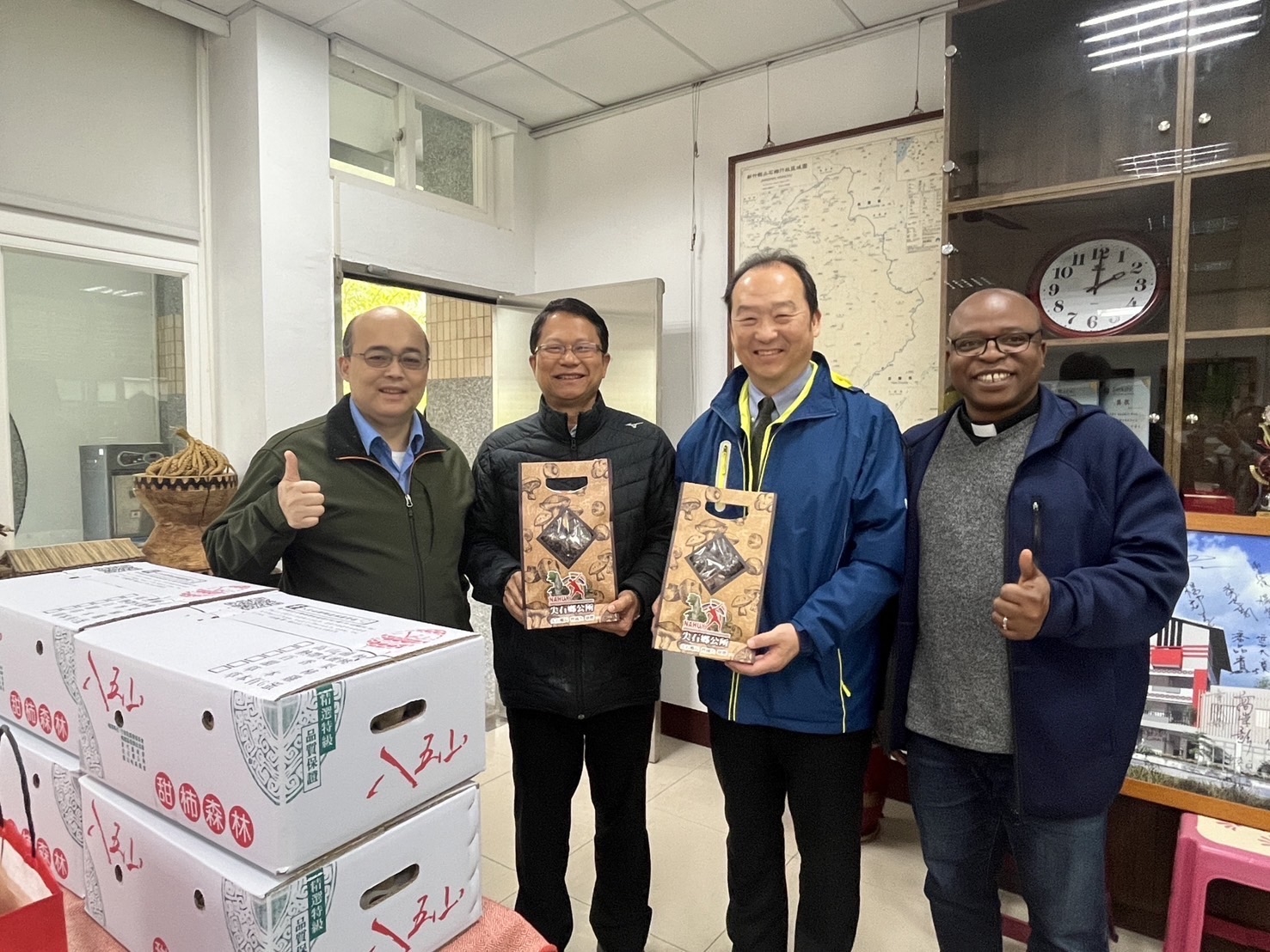 左起劉建民議員、彭清宏校長、陳方濟校長、莊若瑟神父為雙石結盟加溫   何高祿攝