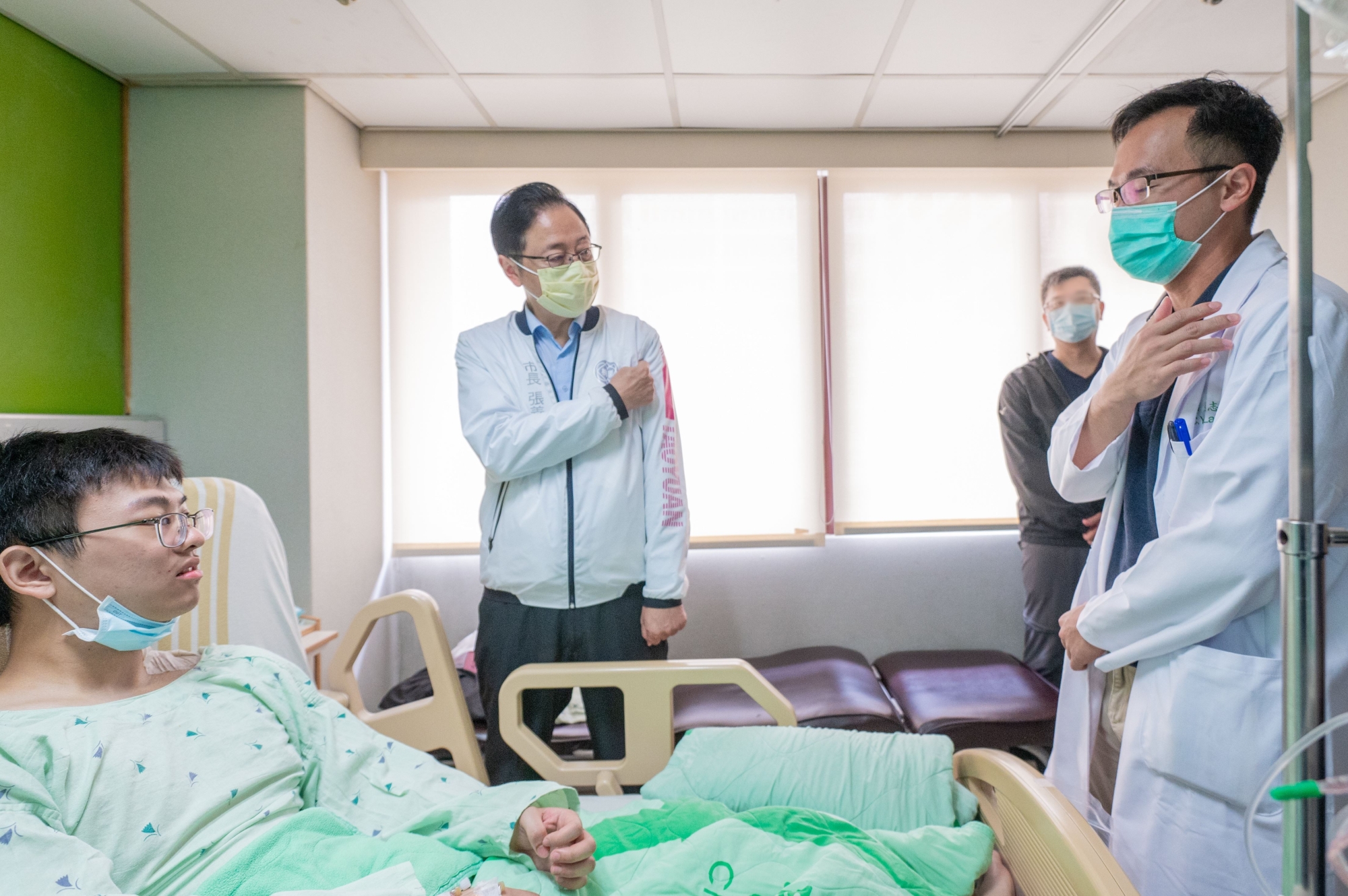 張善政當面向員警的父母致意,並致贈慰問金,蔡員警的父親是退休警察,兩代投入打擊犯罪,令人非常敬佩。並且親自向主治醫師了解員警傷勢,希望他接下來好好復健,早日康復。