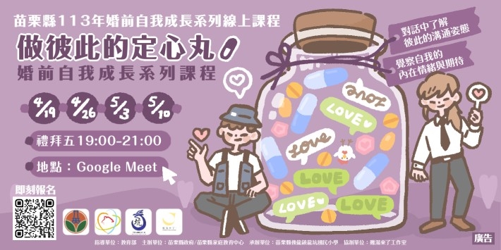 為協助有意深入了解感情世界的人學習溝通和共同經營關係,苗栗縣家庭教育中心誠摯邀請您參加113年婚前自我成長系列線上課程。這個課程將於4月至5月間舉辦四堂課,透過Google Meet線上會議室,共同探索愛情的奧妙。