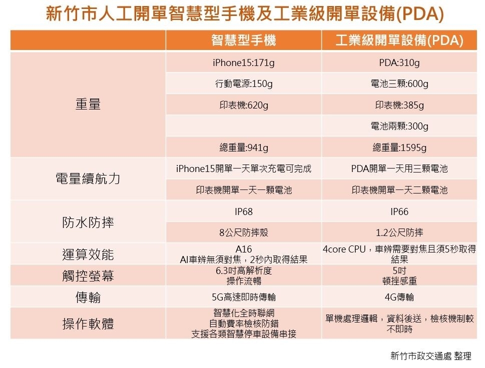 新竹市路邊停車人工開單作業設大升級,市府為解決現有停管員手持工業級開單設備(PDA)的電池續航力差、重量重、網路遲延、輸入車牌易誤植等缺點,全國首創引進智慧型手機iPhone 15開停車單,能協助停管員提升作業效率、減輕工作負擔。