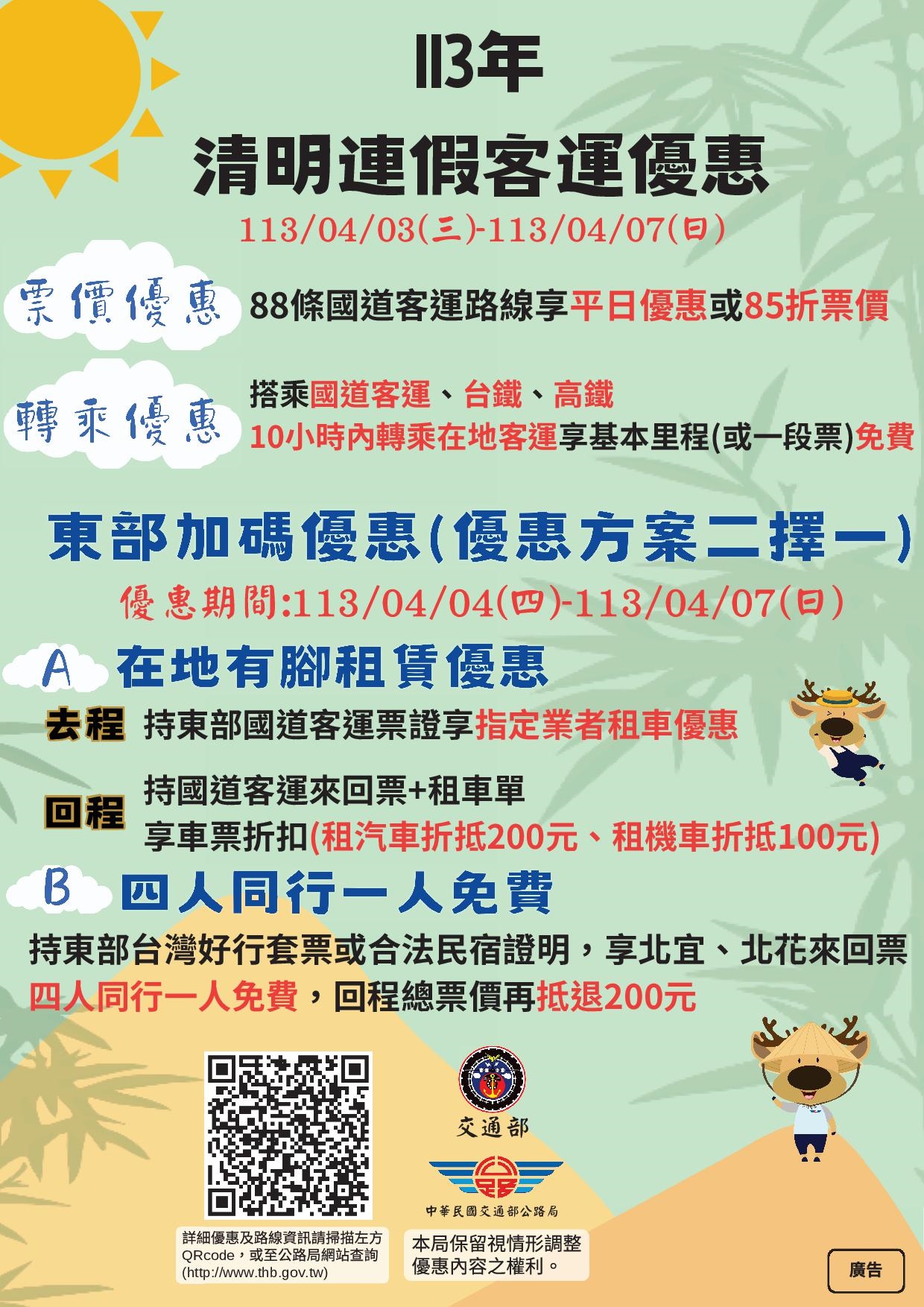 公共運輸優惠部分,清明連假將實施國道客運票價優惠及轉乘優惠,民眾於113年4月3日至7日期間,搭乘指定國道客運路線可享受平日優惠價或票價85折優惠,另搭乘臺鐵、高鐵及國道客運使用同一電子票證,於10小時內轉乘在地市區客運或公路客運路線,享一段票或基本里程免費優惠。