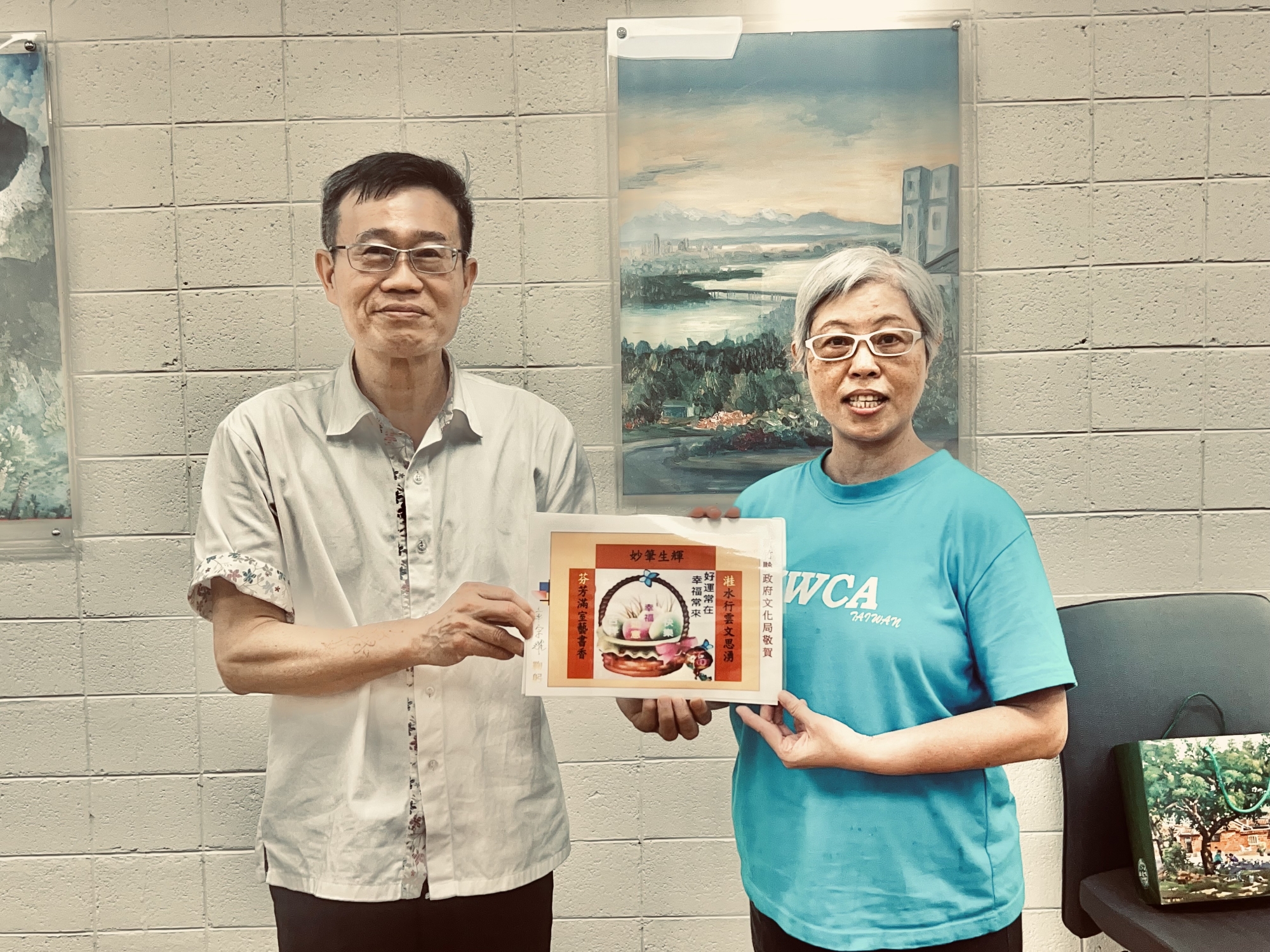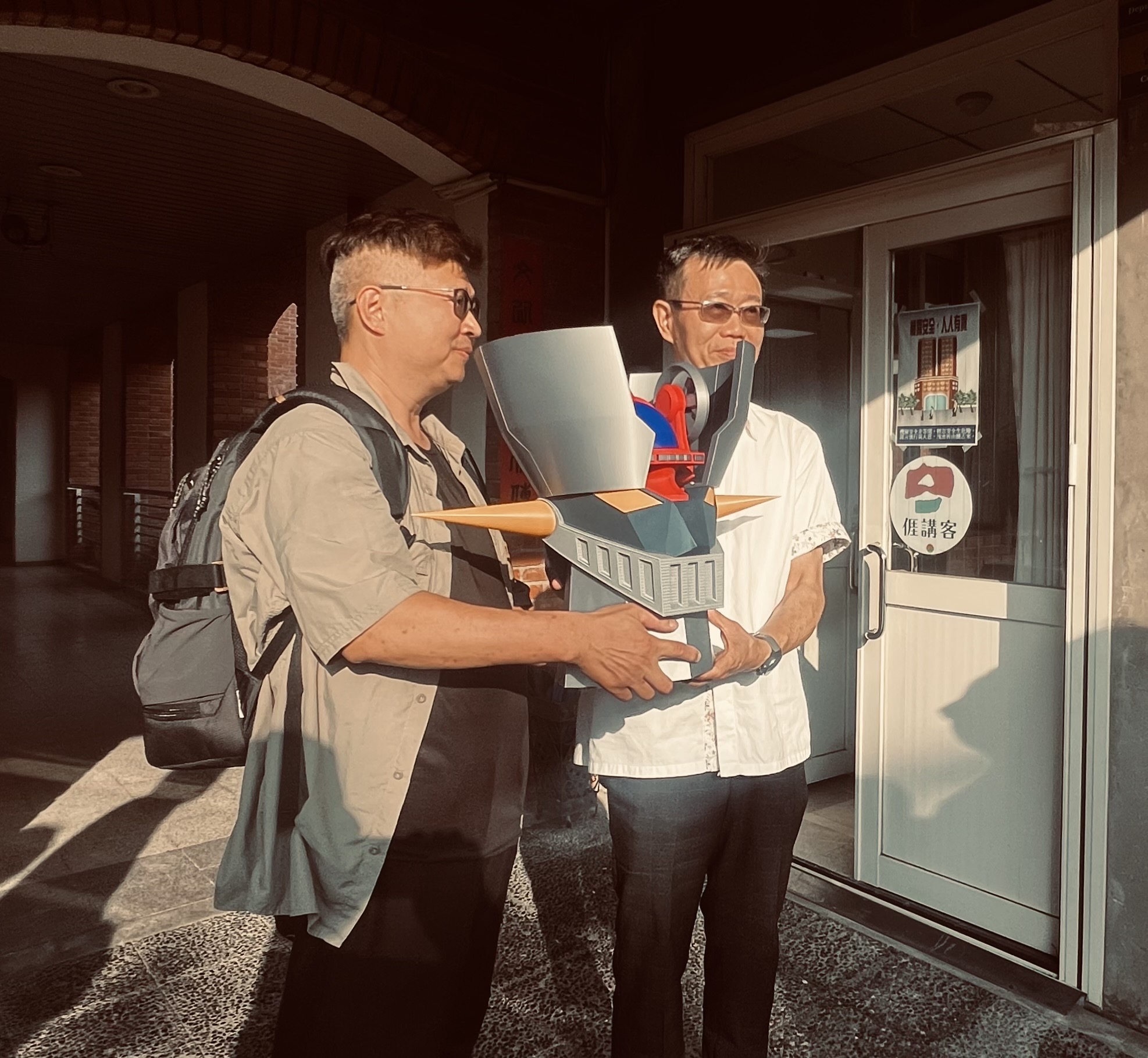蔡世明(左)贈送自創無敵勇士給大學長致賀 何高祿攝