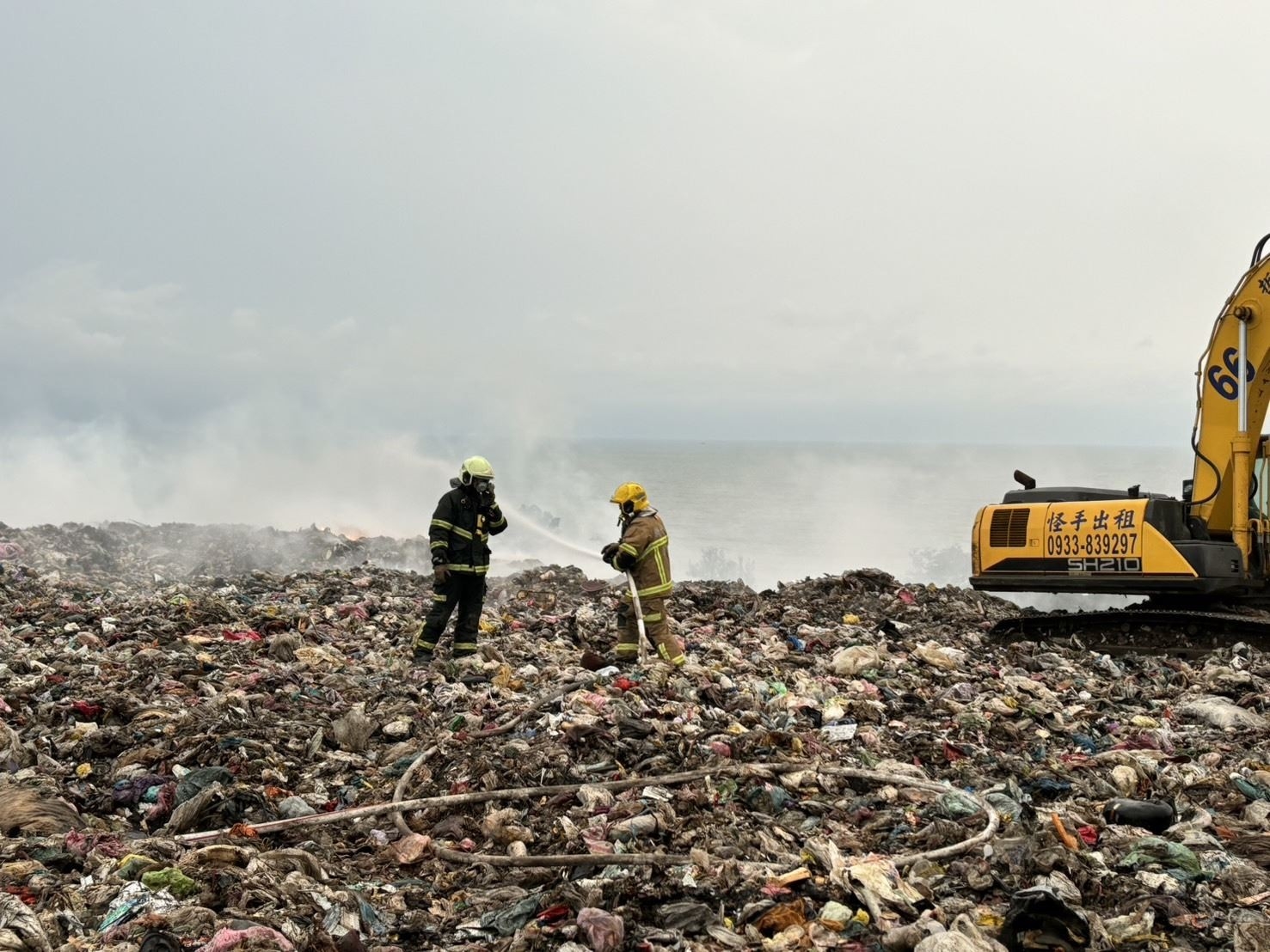 消防局表示,昨晚間於掩埋場部署5條水線2具砲塔,出水過程搭配挖土機挖開悶燒垃圾,消防人員逐步控制燃燒範圍,並從三面進行滅火作業,今早請持水線人員持續射水,降低垃圾下方殘餘高溫,避免火勢再度復燃。