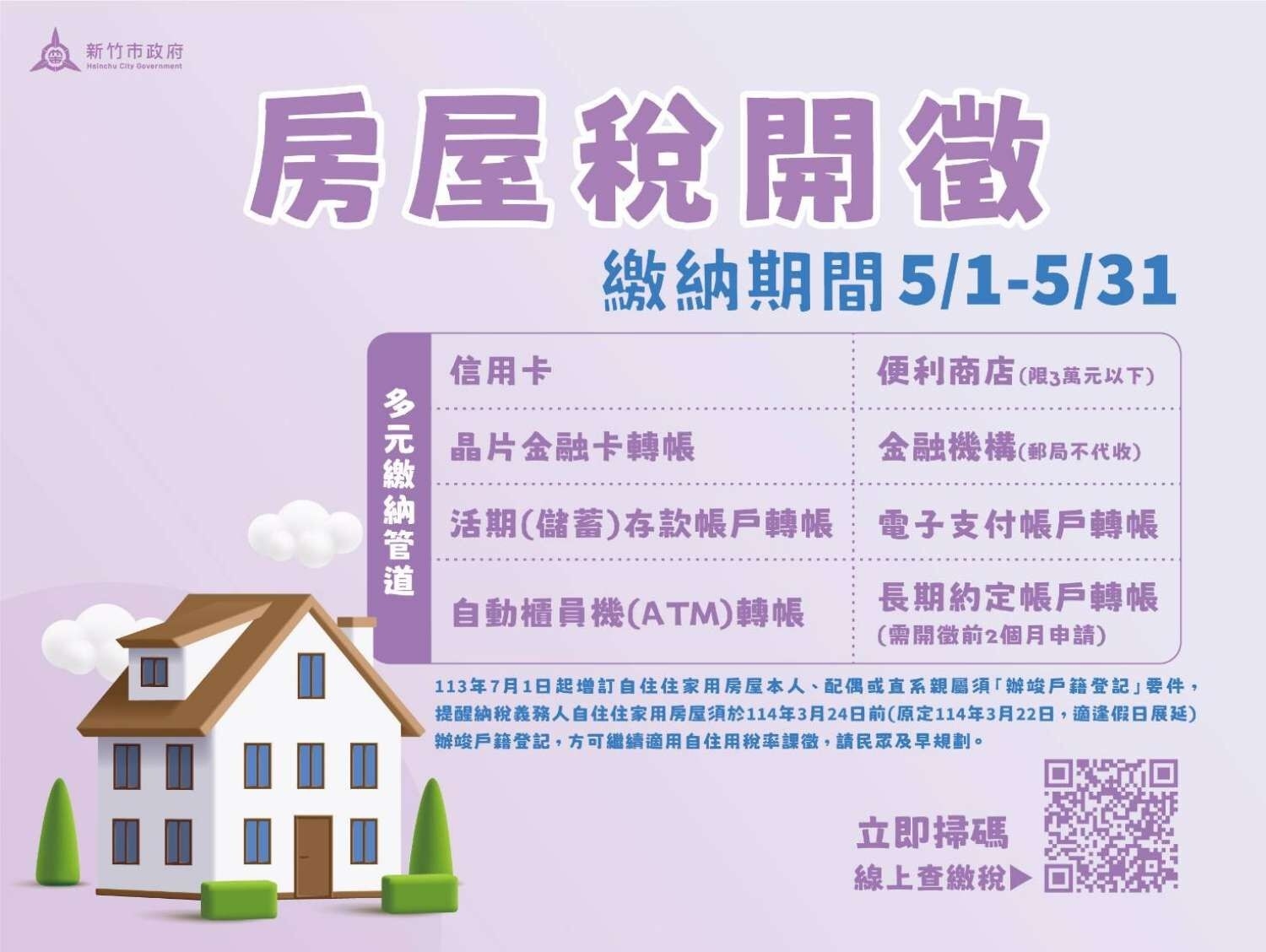 113年房屋稅將於5月1日開徵,竹市稅務局提醒,繳納期限至5月31日,稅單及轉帳繳納通知已於19日全面寄發,民眾收到稅單後,應先檢視稅單所載內容是否正確,並於期限內繳納,以免逾期繳納被加徵滯納金。若未收到或遺失稅單,可利用線上查繳稅系統查詢繳納,可利用便利商店多媒體資訊機查詢。