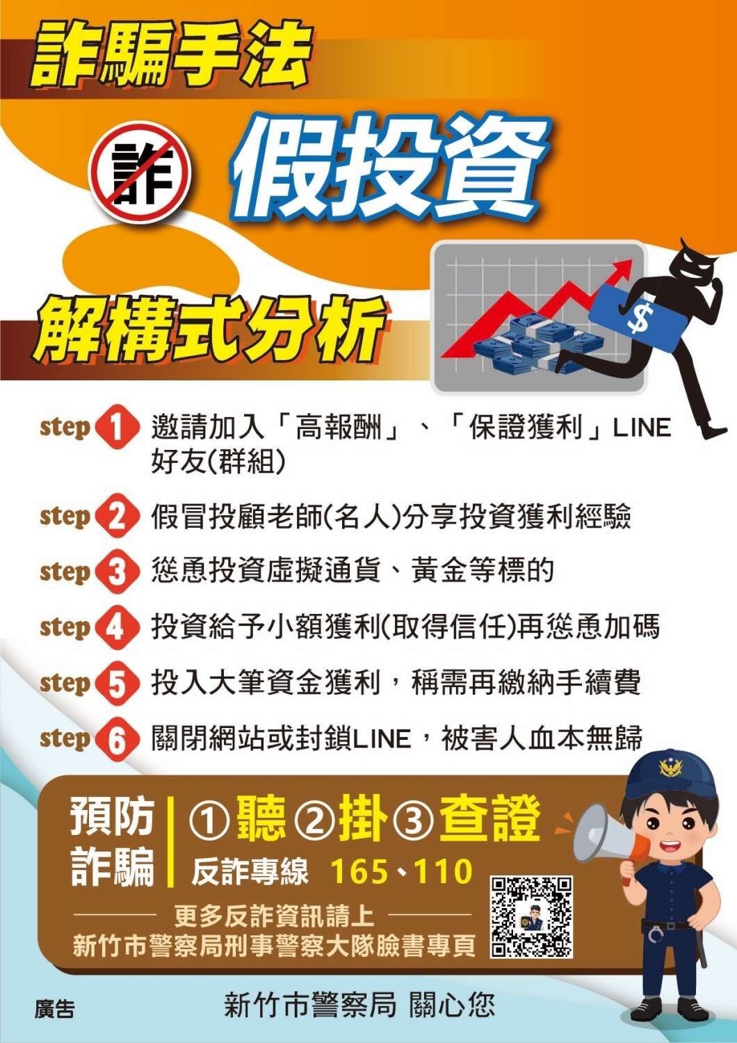 竹市警察局長邱紹洲表示,近期假投資詐騙手法盛行,網路購物詐騙也不少,隨著人工智慧發展,AI也可能用來詐騙,此次配合警政署執行打詐專案,強力查緝各類詐騙犯罪,嚴懲並瓦解詐團勢力,同時也推出防止AI深偽換臉詐騙影片及反詐文宣,提升民眾識詐意識,強化反詐免疫力。