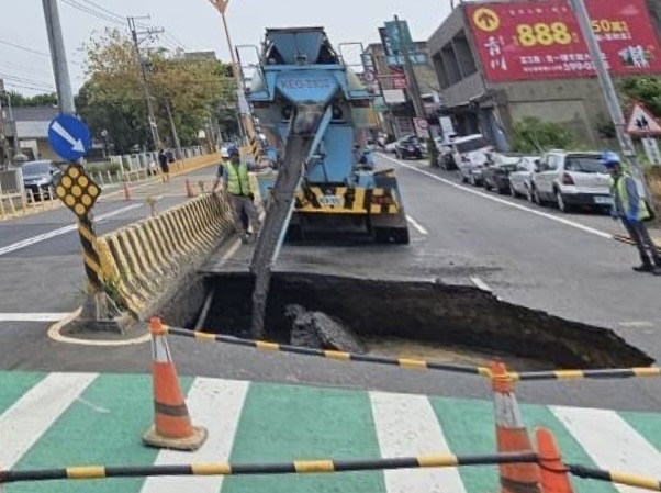 竹縣湖口成功路驚傳天坑,縣府要求台電工程10日內透地雷達報告,成功路灌漿搶修於4日中午完成,目前雙向單車道通行。
