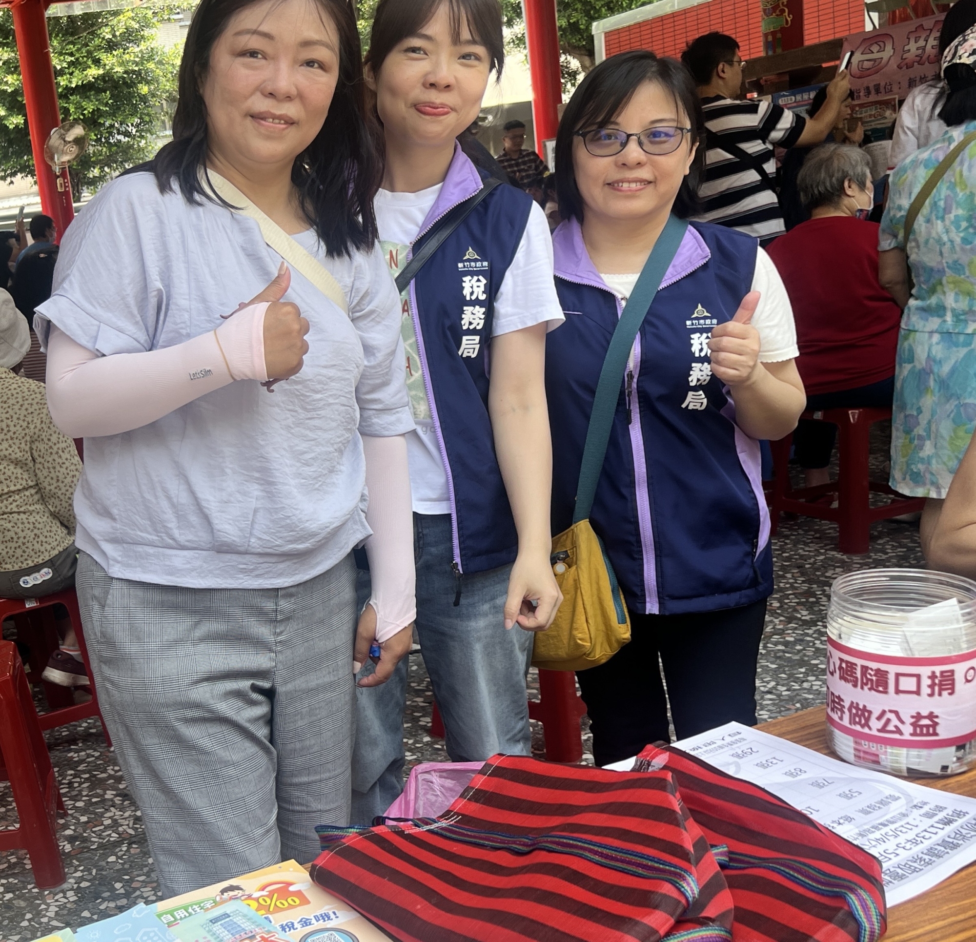 新竹市稅務科長張曉玲(右)和同仁柔性宣導稅務 何高祿攝