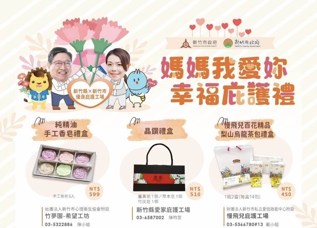 溫馨感恩五月到來,為迎接母親節,庇護工場準備多樣母親節禮盒,而今年度新竹縣市庇護工場更首次攜手合作,共同推出「媽媽我愛妳.幸福庇護禮」母親節禮盒。