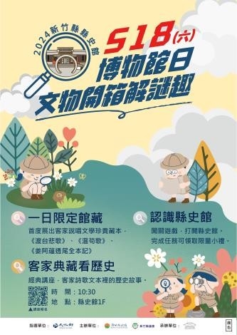竹縣文化局長章宗耀表示,縣史館是新竹縣重要的文化研究、教學與展演空間,今年的博物館日以珍貴館藏文物開箱,搭配經典講座,特別邀請國立陽明交通大學客家學院人文社會學系羅烈師副教授,及客家文學研究學者、《客諺第200首》作者何石松博士,透過講座對談,帶領民眾從三本客家詩歌文學中,解析過去先民開墾竹縣的過程,講座時間為5月18日上午10:30至11:30,歡迎報名免費入場。