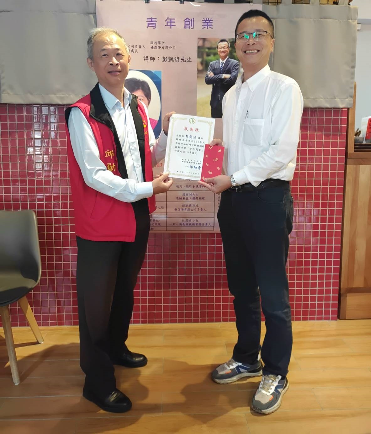 113年度協助地方服務網絡推動專案服務計畫,新竹市榮協開鑼囉,第一場青年創業專題講座,邀請優潔淨公司負責人,新竹市柴橋里社區發展協會副總幹事彭凱諺。一點一滴居家長照機構負責人林莉娟分享青年創業的心路歷程。