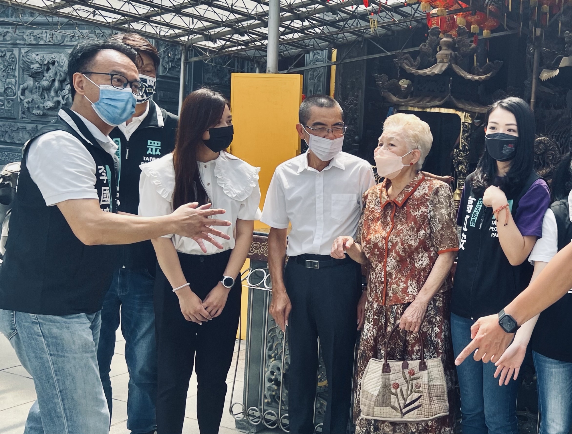 天公壇主任委員方榮准(前左) 送沈慧虹( 右) 出廟門 何高祿攝
