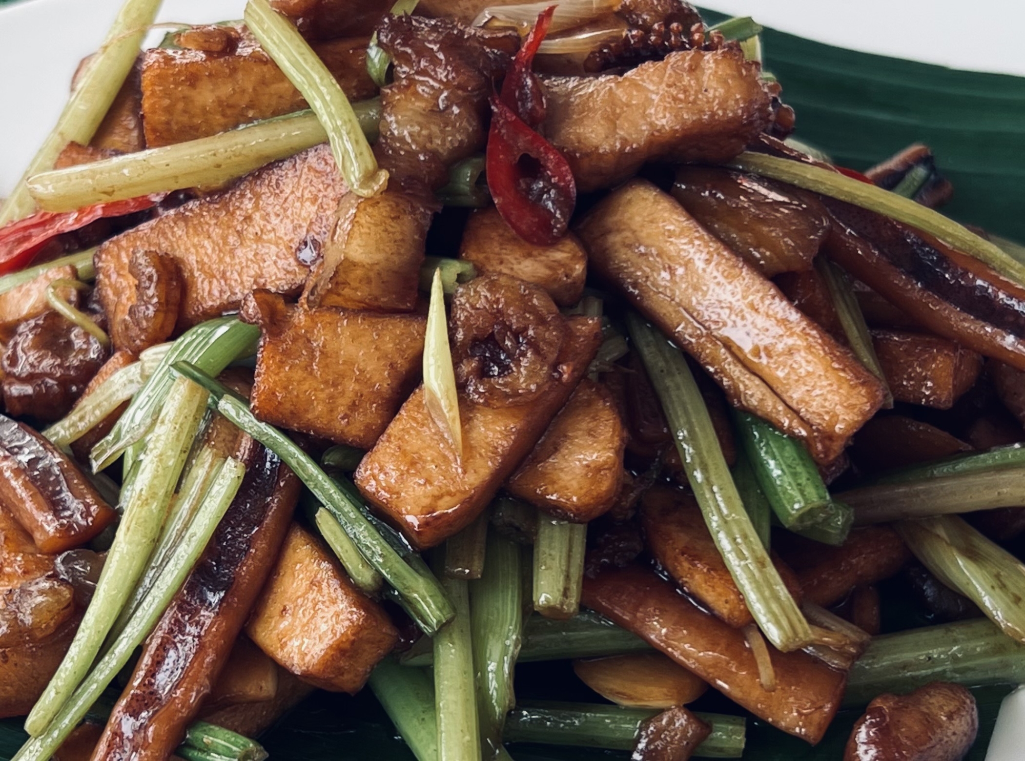 傳統風味客家小炒,是客家菜的臺柱,在細品這一道菜過程中,五花肉、豆乾、魷魚、芫荽、芹菜、蔥與醬油,在人口前即感受到各種不同結合,有硬有軟,有靭有脆,更可以讓食客多加些飯量,即鹹又辣、油亮又香氣十足的重口味家常菜。