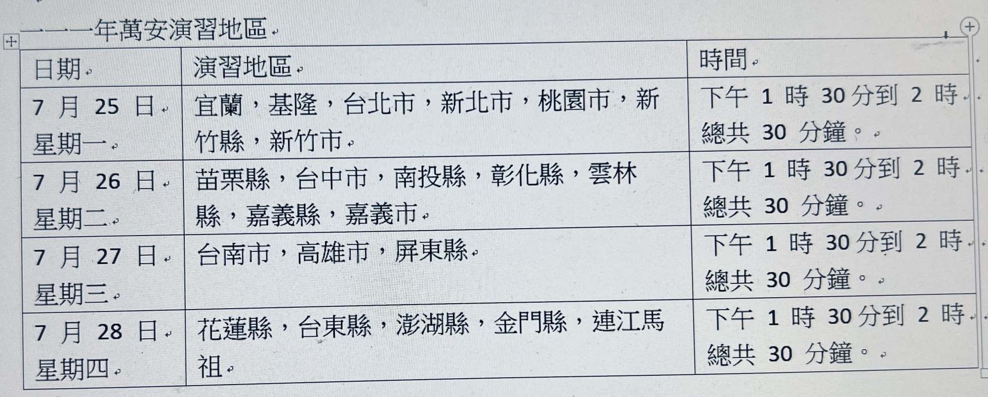 新竹市以北到宜蘭地區7/25(一)13:30-14:00,首先演習區,注意警報發放後請聽從軍警和民防人員指引,進防空疏散避難區,避免人員外出,違者處新台幣3萬元以上15萬元以下罰鍰。