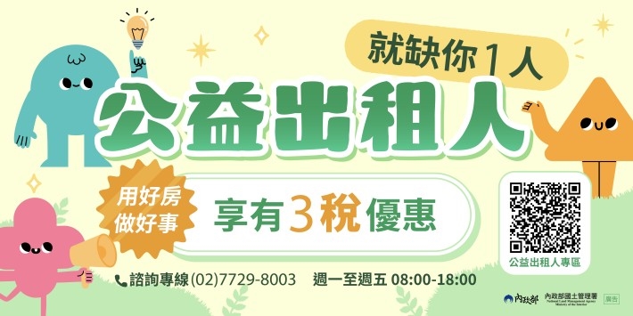 又依同法第15條規定,經認定為公益出租人的房東,於申報綜合所得稅時,享有每屋每月租金收入最高為新臺幣(下同)15,000元的免稅優惠,另房屋稅同自住住家用稅率1.2%、地價稅亦同自用住宅用地稅率2‰。