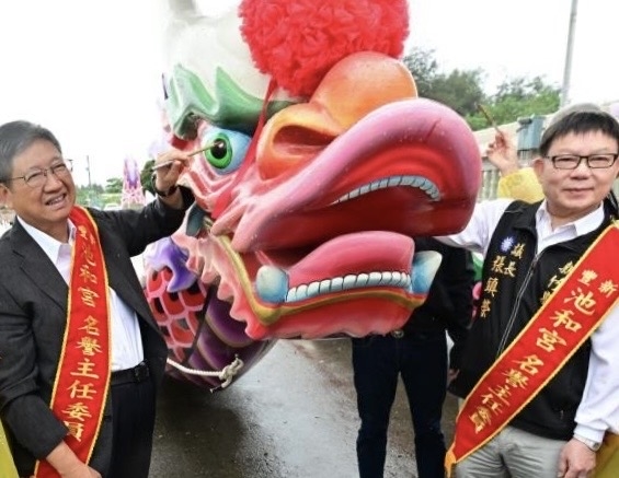 楊文科(左)、張鎮榮(右)同披池和宮名譽主委彩帶為龍舟點睛,擂起熱鬧鼓聲 何高祿攝