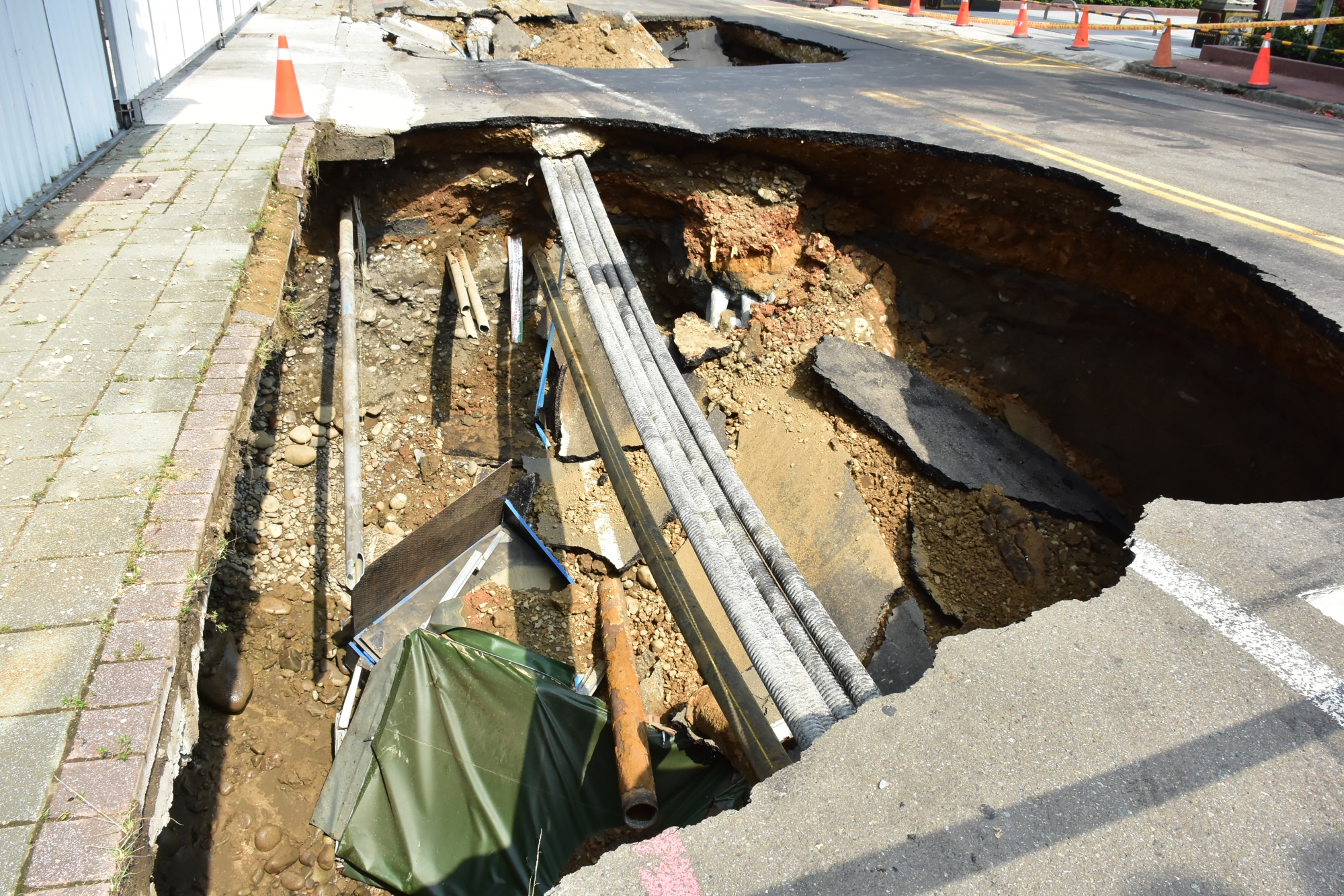 工務處長江良淵指出,坍方原因初步判斷是前陣子的豪大雨,加上前2天的午後雷陣雨,雨水從北側的豆子埔溪往南側的頭前溪在地下水流動時,因為工地持續抽水,阻水措施沒有做好,造成勝利二路的道路下方土石沖刷,路面地基不穩、塌陷。