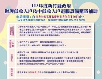 竹縣政府為協助經濟弱勢家庭在學學生提升資訊運用能力,營造多元資訊學習環境,減少數位落差,自今年6月3日起至7月16日止,受理弱勢家庭申請電腦設備購置補助,凡符合申請資格並完成規定的社會參與時數者,最多可補助1萬元至1萬5000元。