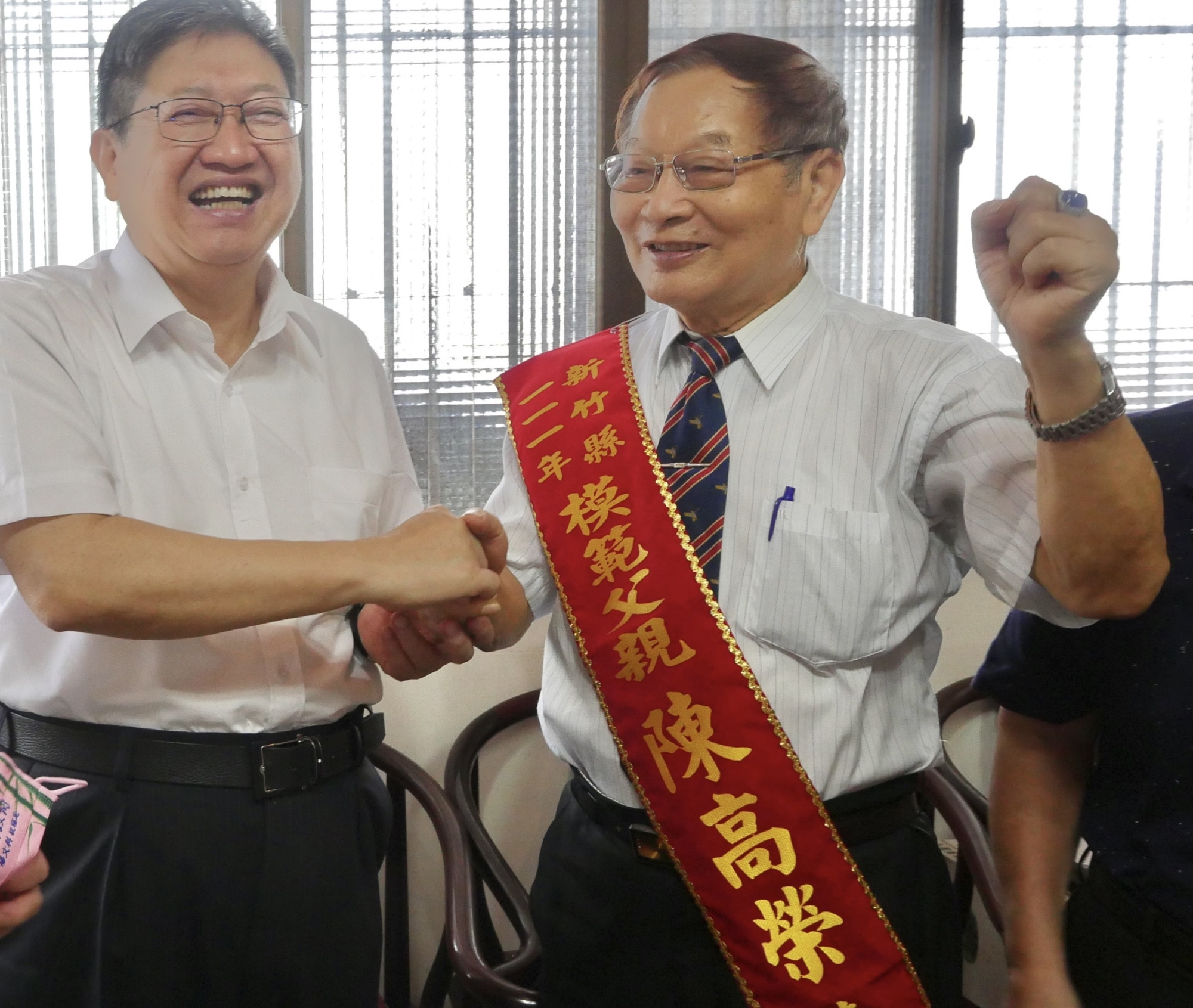 新竹縣長楊文科開懷表揚他的啟蒙老師陳高榮當選模範父親