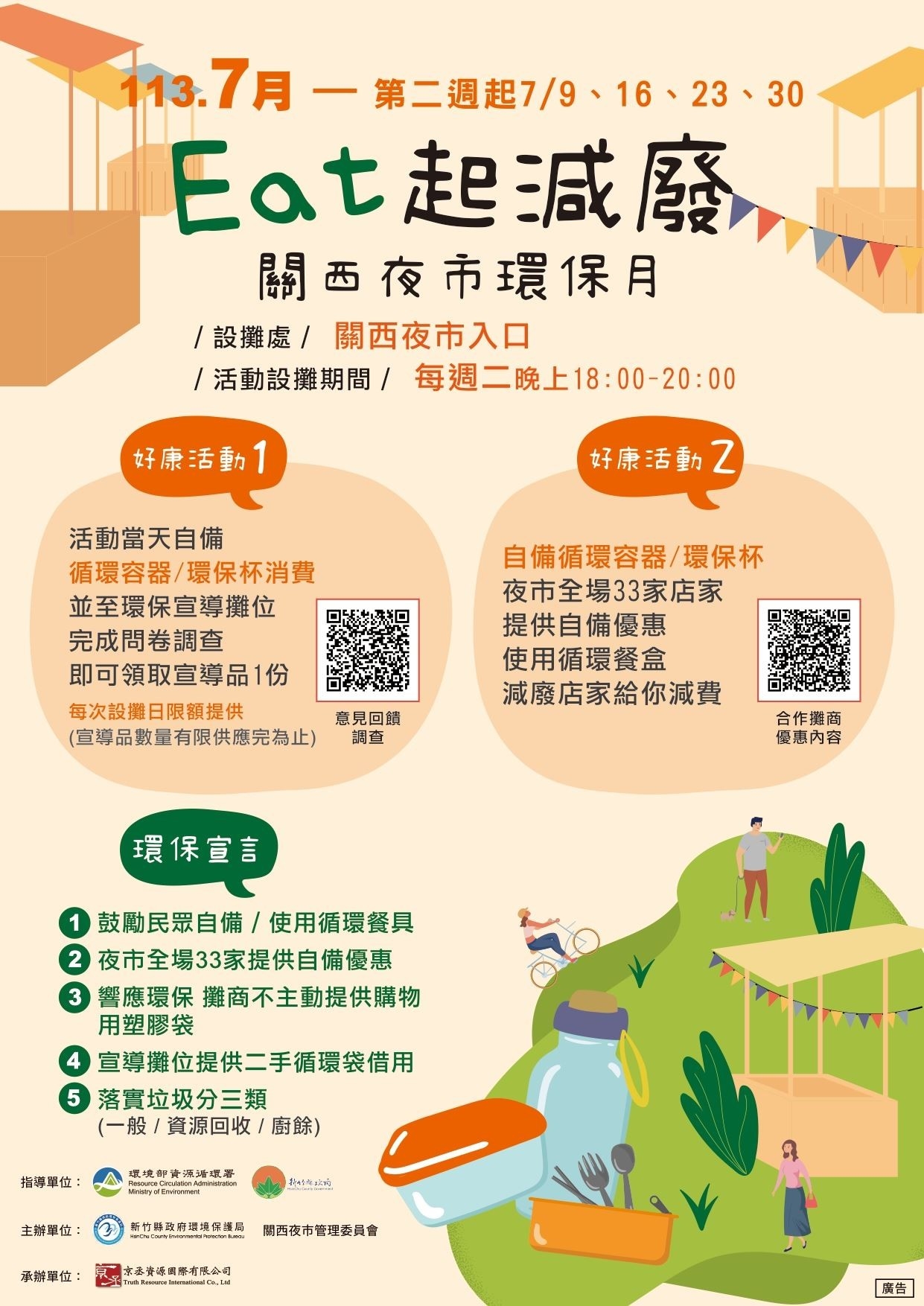 環保局表示,「Eat起減廢 關西夜市環保月」活動期間為7/9、7/16、7/23、7/30共4天,響應全球減塑生活,夜市33個攤商將不主動提供購物用塑膠袋,並補助5家內用大吃攤汰換免洗餐具為循環容器。